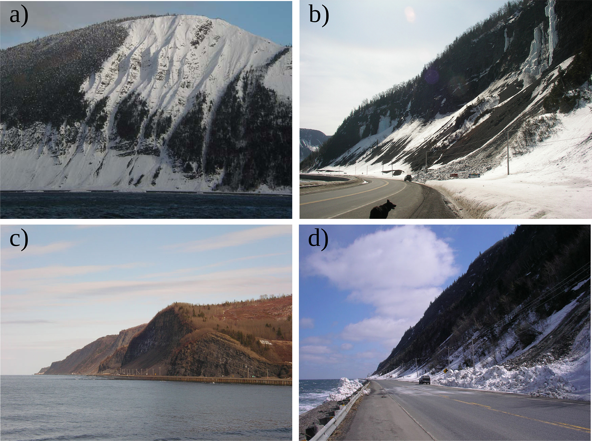 Figure 2View of avalanche slopes along road 132 east (a) and west (b) of Mont-Saint-Pierre (section 10), along road 132 east of Gros-Morne (sections 120 and 130) (c, d).
