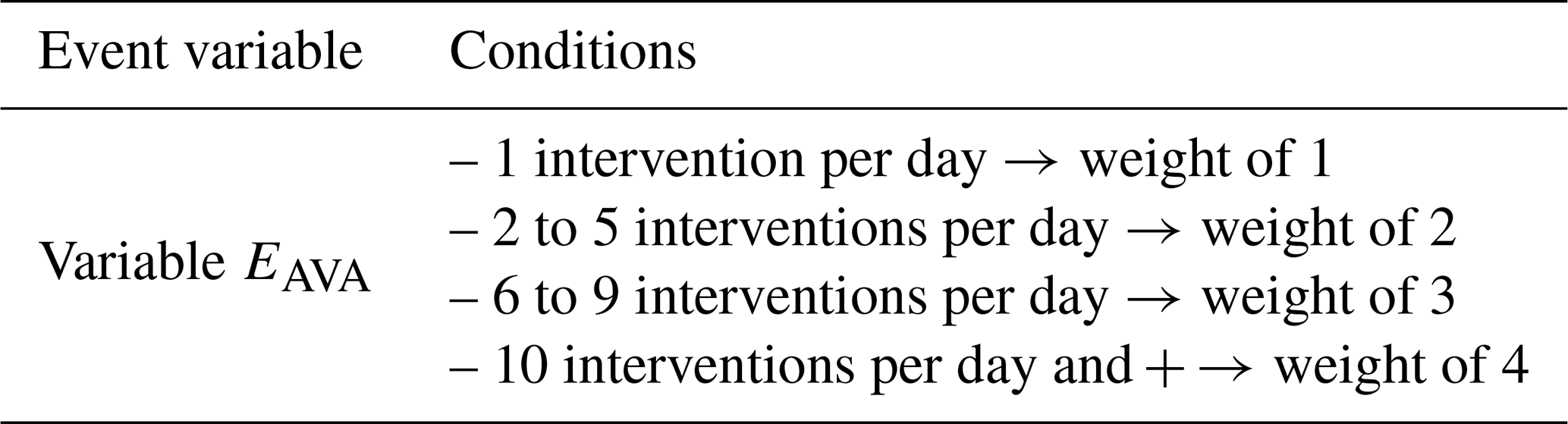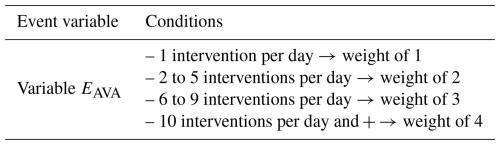 The avalanche event database used in this study records all snow avalanche events from the winter 2003–2004 to 2019–2020. The avalanche observations are collected by MTMQ road patrol to assess the road conditions for rock and ice falls, snow avalanches, as well as storm surge at all times. The observations are recorded at the hour of discovery of the debris, within a few hours of the actual avalanche. Even when the road is closed to the public, road patrol still moves along the road to assess road conditions and make observations. Then, the hourly events are summed to a daily (midnight cutoff) dataset that contains the number of snow removal interventions on the road, the avalanche corridor, whether or not the road was reached, and the distance traveled (ditch, shoulder, 1 lane, 2 lanes). The type (dry or wet) and avalanche size are not recorded by the road patrol, and therefore, cannot be used in the analysis. The majority of these observations of avalanches were on the slope and have not reached the road and required intervention. Therefore, for a day to be considered an event, a snow avalanche must have reached the road (shoulder, 1 lane, or 2 lanes). Observations of avalanche deposition in the ditch or on the slopes were not included in the analyses. A binary event day variable (EAVA = “avalanche day” or “no avalanche day”) was created for days where an avalanche has reached the road, regardless of the size or path length because this information was not recorded (Table 1). If more than one intervention (avalanches) reached the road, duplicate event days were added to the dataset with the following weight of 1, 2, 3, or 4 duplicate days with respect to one intervention, two to five interventions, 6 to 9 interventions, and 10 or more interventions (Table 1). The weights were assigned manually by looking at the frequency distribution of events (Fig. 4). Finally, for the training dataset only, in order to get a symmetric binomial distribution and avoid over-representation of days where no avalanche was observed, the same number of days were randomly selected where avalanches were not observed on the road. This duplicated days by weight and the balance of event days were only done on the train dataset. The constitution test is described below in Sect. 3.4.