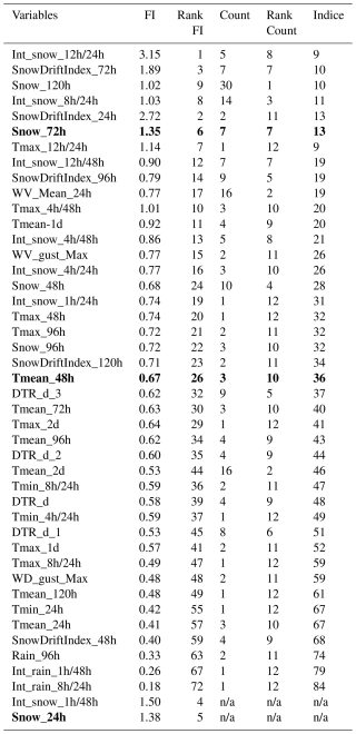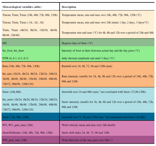 The challenge in developing a good predictive model is to strike a balance between selecting a minimum number of non-redundant explanatory variables and maintaining an optimal level of performance. Principal component analysis (PCA) and cross-correlations (correlation matrix) were used to group variables that showed colinearity. Based on the results of these analyses and our understanding of the physics of snow avalanche development mechanisms (e.g. Lehning et al., 1999; McClung and Schaerer, 2006), seven groups of variables were defined (Table 3). Thus, only one variable per correlated group can be used by the different ML models.