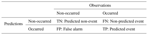 The required quality of meteorological data needed to feed physical snow simulation models (e.g. Morin et al., 2020) restricted us to statistical avalanche forecasting approaches based on the analysis of avalanche and meteorological data. The first step in improving data-driven avalanche forecasting is to establish causal links between meteorological conditions and their occurrence (Ancey, 2006; Castebrunet et al., 2012; Durand et al., 1999; Germain, 2016; Jomelli et al., 2007). A wide variety of statistical approaches have been used to explain and predict avalanche occurrence (e.g. Perla, 1970; Bois et al., 1975; Buser, 1983; Hendrikx et al., 2014). On a seasonal scale, logistic regression (LR) has been used to establish relationships between winter weather conditions and very large avalanches (Hebertson and Jenkins, 2003; Jomelli et al., 2007). This type of analysis has rarely been used to support the development of operational statistical forecasting models on a daily scale (Jomelli et al., 2007; Gauthier et al., 2017). Classification trees (CT) were also used to predict avalanche days according to a series of criteria or trigger thresholds (Davis et al., 1999; Hendrikx et al., 2005, 2014; Peitzsch et al., 2012; Gauthier et al., 2018). The use of automated machine learning methods, such as neural networks (NN) or random forest (RF), is now more widely used to support the development of statistical avalanche forecasting models (e.g. Singh et al., 2005; Schirmer et al., 2009; Blagovechshenskiy et al., 2023). Recently, these more elaborate machine learning algorithms have been coupled with snow cover model outputs to predict avalanche danger level (Pérez-Guillén et al., 2022), wet avalanche activity (Hendrick et al., 2023), and dry-snow avalanche activity in the Alps (Mayer et al., 2023; Viallon-Galinier et al., 2023). While the implementation of snow cover models is promising, these types of machine learning methods have rarely been tested with numerical weather prediction data (NWP) or in an operational context. Yet, only one study tested the performance of 24 h NWP to predict wet snow avalanche activity (Hendrick et al., 2023). Ultimately, the machine learning method used remains a choice on which there is no consensus and sometimes seems to follow the major trends of the moment. Very few studies have evaluated the advantages and disadvantages (Davis and Elder, 1994) or compared the performance of these various statistical and machine learning methods (Schirmer et al., 2009; Gauthier et al., 2017). Our study aims to train and test the performance of different forecasting models. We use four machine learning (ML) algorithms to predict avalanche days based on various meteorological variables. Our study also aims to evaluate and compare the predictive performance of each machine learning algorithm in an operational avalanche forecasting context using NWP data. We then discuss the link between the probability of an avalanche occurring and avalanche danger level, providing a more solid base for risk management operational procedures.