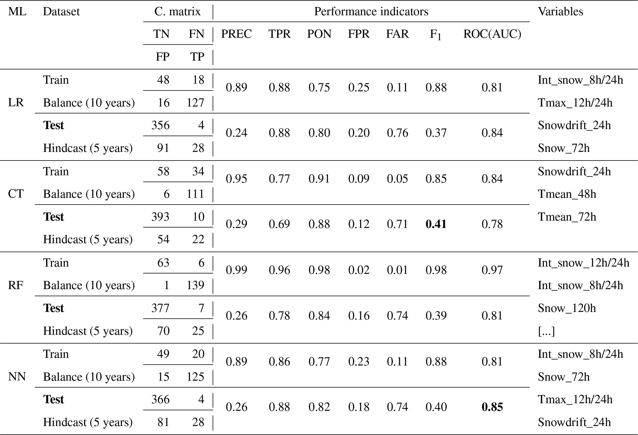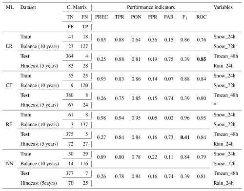 Table 8Avalanche Québec's forecast performance between 2013 and 2020 (5 operational seasons). The performance metrics are computed with the avalanche event dataset where avalanches reached the road. An event day is considered when the danger level is Considerable or High (avalanche expected on the road), according to Table 2. The confusion matrix is presented under C. Matrix. The performance indicator abbreviations are defined in Table 5. In bold, the best F1 score and PREC for the Test dataset.