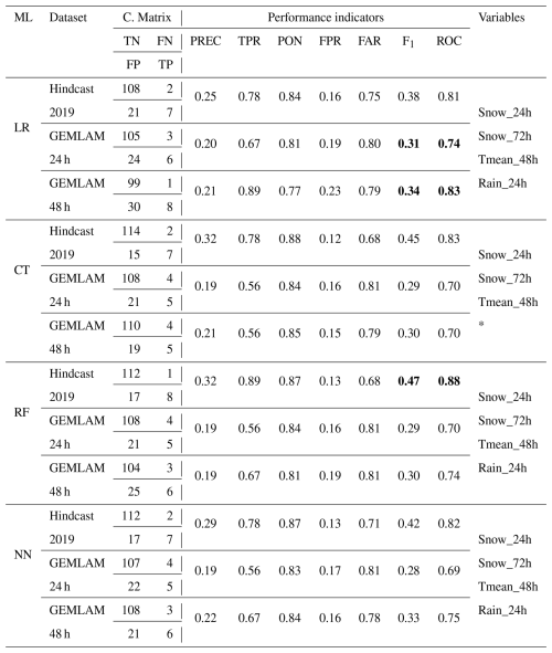 Table 9Performance of expert models on the event variable (EAVA) for Hindcast 2019 vs. NWP 2019 (GEMLAM24-48h). In bold, the best F1 score and ROC(AUC) of the hindcast and GEMLAM24-48h. The performance metrics are computed with the avalanche event dataset where avalanches reached the road. An event day is considered when the probability of the model is above 50 %. The confusion matrix is presented under C. matrix. The performance indicators abbreviation are defined in Table 5. The Variables are defined in Table 3.