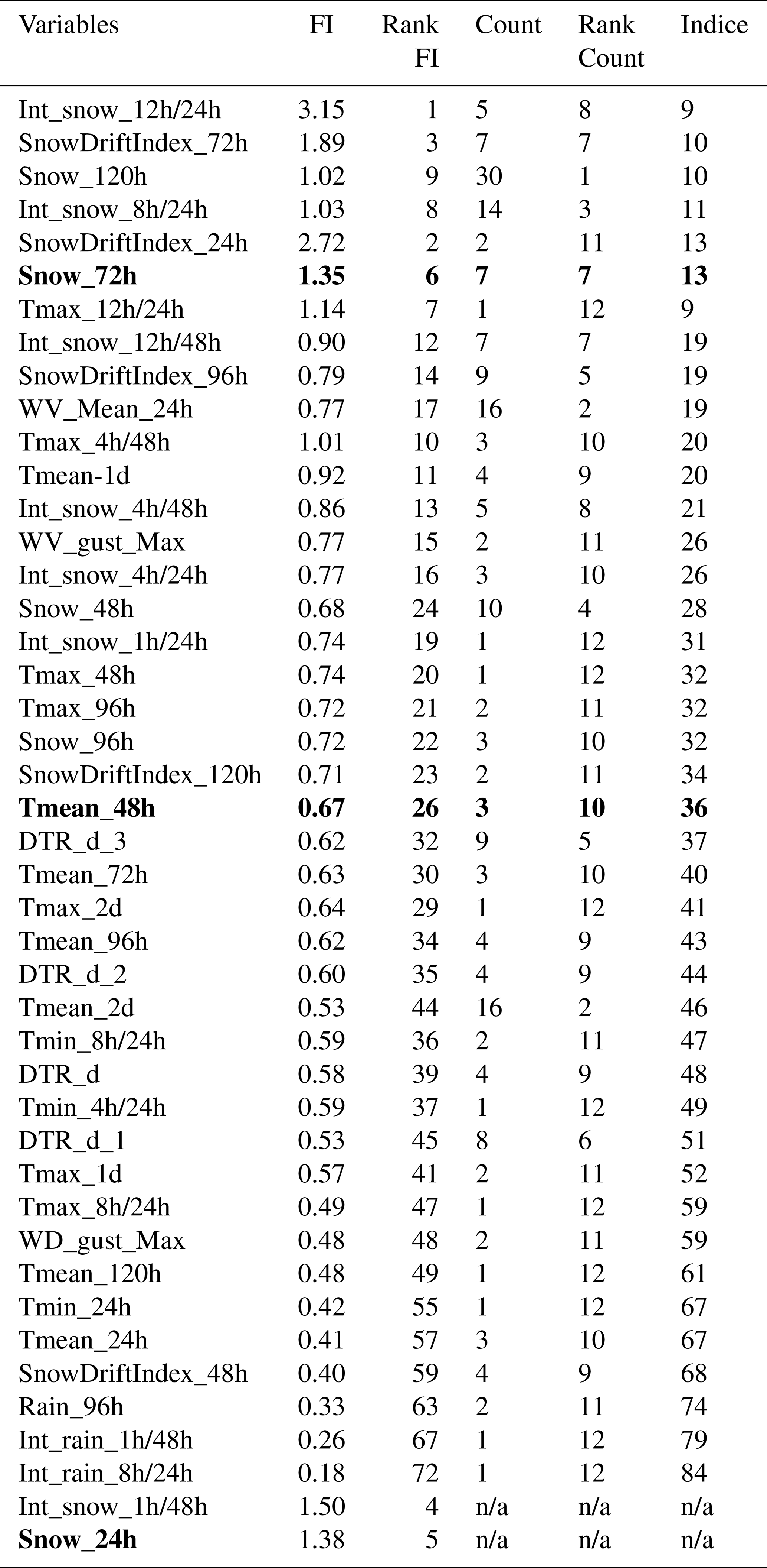 Maximum snow intensities 12/24 or 8/24 h (Int_snow) are the most redundant and important variables selected by three of the four models: LR, RF and NN (Table 6–A1). Total snowfall over 72 or 120 h (Snow) and windy snow indices over 24 and 72 h (SnowDrift) are frequently recurring variables with a very high level of importance for all models. Average temperatures over 48 and 72 h were used by CT (Table 6). These are not, however, variables that were frequently selected or had a high level of importance when the models were trained (Table 6).