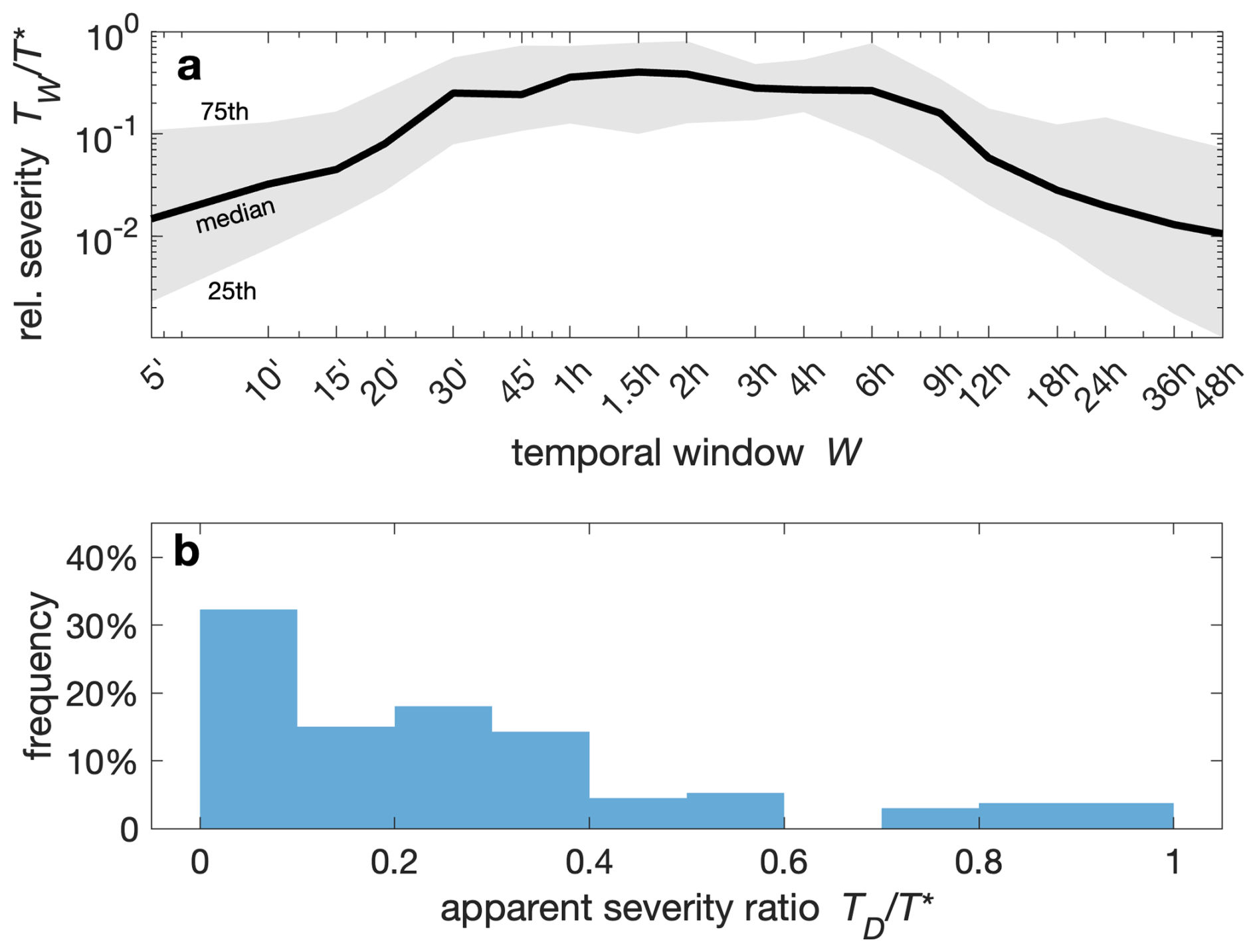 Figure 2(a) Relative severity of the triggering precipitation for varying temporal window W. The relative severity is computed as the ratio between the return period at the time scale W, TW, and the maximum return period T*. The solid line and shaded areas represent the median and inter-quartile range across the 133 debris flows. (b) Apparent severity of the triggering precipitation obtained as the ratio between the return period of the precipitation over the entire storm length D, TD, and the maximum return period T*.