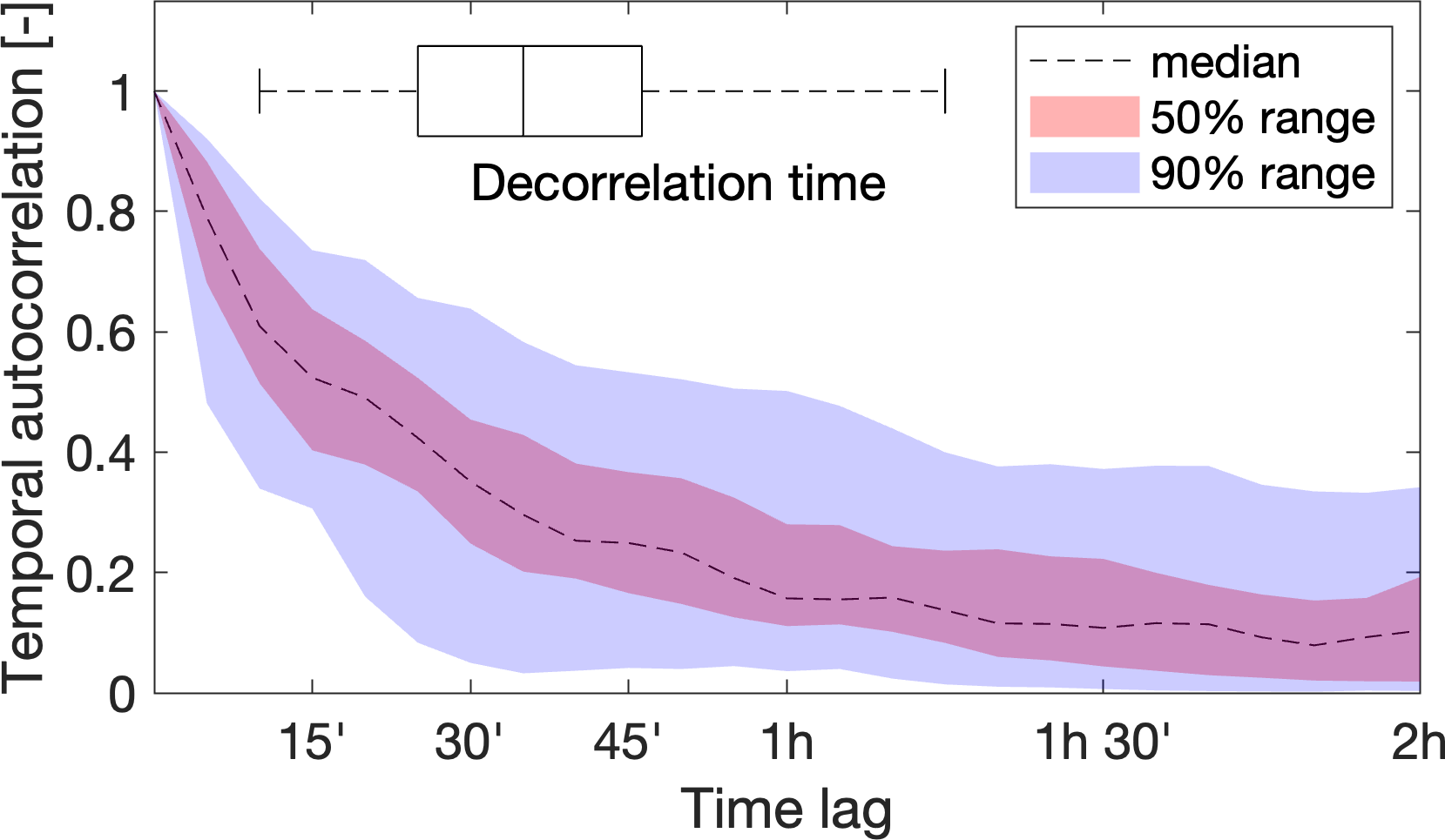 Figure 3Temporal autocorrelation of the precipitation time series for the 133 debris-flow triggering events. Red and blue shaded areas show the 50 % and 90 % ranges across the 133 debris flow triggering events. The horizontal boxplot shows the distribution of the decorrelation times, calculated as the lag time at which the autocorrelation drops below e−1.