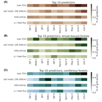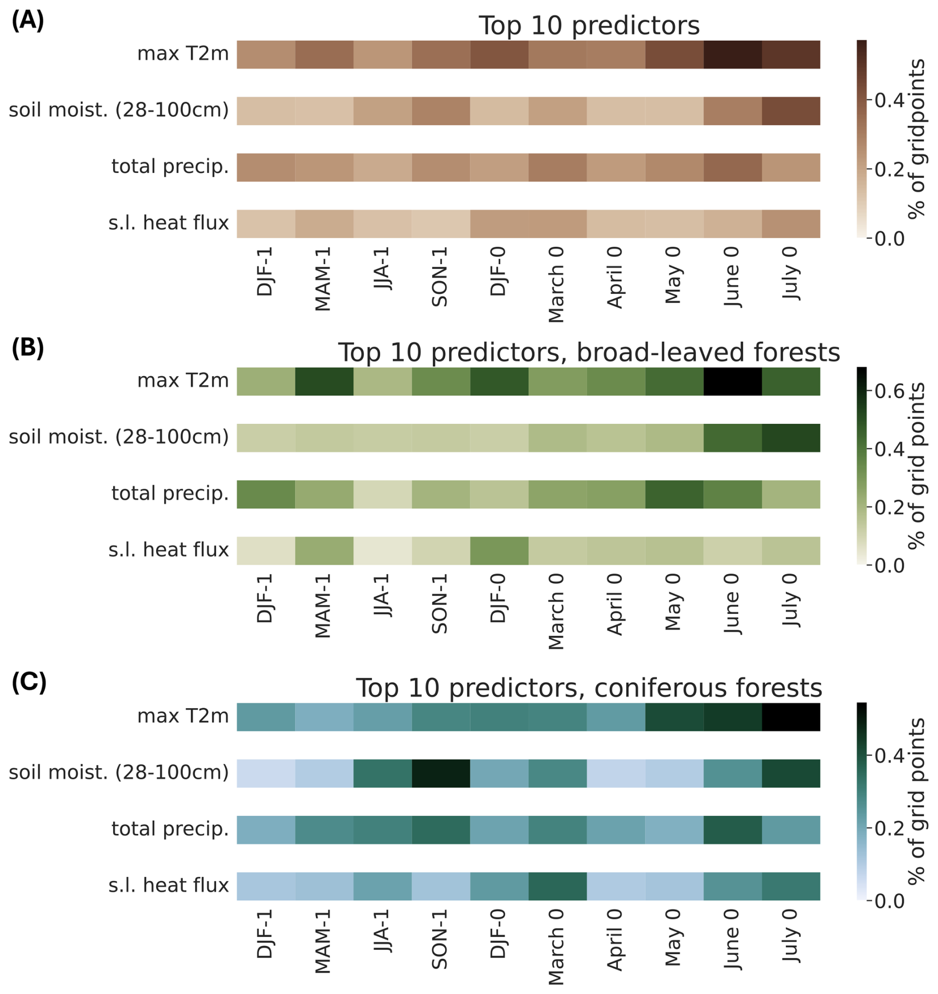 Figure 4Importance of the predictors for all forest grid points. Each cell represents one predictor presented in Fig. 1, i.e., a given variable (y axis) for a specific time period (x axis). The color shading of each cell indicates the percentage of grid points where this predictor ranks among the top 10 most important predictors in the random forest model. The percentage is calculated for (A) all forest grid points over Europe, (B) broad-leaved forest grid points only, and (C) coniferous forest grid points only.