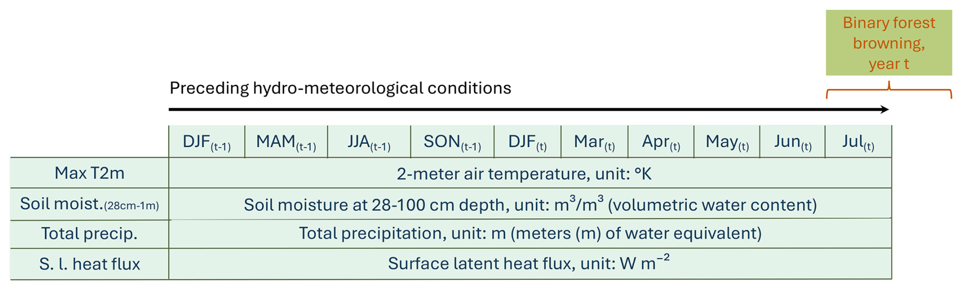 Figure 1Predictors used to model binary forest browning in July–August of year t, based on 4 hydro-meteorological variables across 10 seasonal and monthly time periods. Each row represents one variable, and each column corresponds to a time step (seasonal or monthly anomaly), resulting in 40 potential predictors. The hydro-meteorological variables include: maximum 2 m air temperature (Max T2m), soil moisture at 28–100 cm depth (Soil moist. (28–100 cm)), total precipitation (Total precip.), and surface latent heat flux (S.l. heat flux). Time steps include seasonal means before the growing season (DJF: December–February, MAM: March–May, JJA: June–August, SON: September–November of the previous year (t−1); DJF: December–February of the same year t) and monthly means during the growing season (March, April, May, June, July). Units for each variable are indicated on the corresponding rows. Note that all predictors used in the random forest model are unitless, as the variables have been transformed into standardized monthly and seasonal anomalies, as detailed in Sect. 2.3.