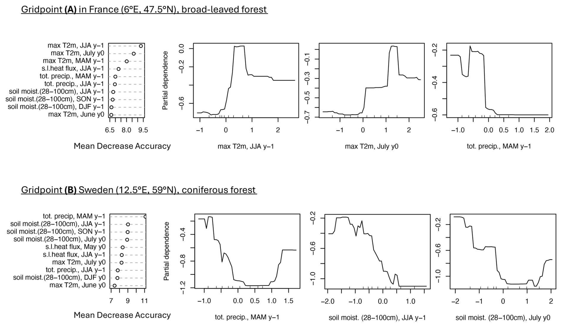 Figure 3Example of predictor mean decrease accuracy and partial dependence for forest browning at two selected grid points. First column: 10 most important predictors (y axis), i.e., predictors with the largest mean decrease accuracy (x axis) for a grid point in broad-leaved forests in France (A) and a grid point in coniferous forests in Sweden (B) (location indicated in Fig. D1). Second, third, and fourth columns: partial dependence of forest browning (y axis) on the predictor's anomalies (x axis), for the three most important predictors. The mean decrease accuracy and partial dependence plots are introduced in Sect. 3.1.
