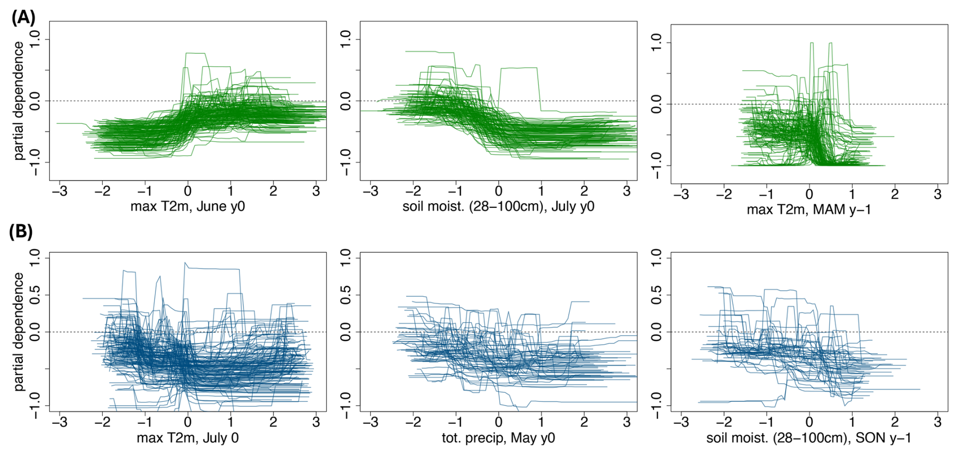 Figure 5Partial dependence of forest browning (y axis) with a given predictor anomalies (x axis), for broad-leaved forest (A) and coniferous forest (B). The predictors are (A) maximum 2 m temperature and soil moisture (28–100 cm depth) in July of the same year, and maximum 2 m temperature in spring of the preceding year, for broad-leaved forests only and (B) maximum 2 m temperature in July of the same year, total precipitation in May of the same year and soil moisture (28–100 cm depth) in autumn of the preceding year, for coniferous forests only. For each dependence plot, we display only the grid points for which the predictor is among the top 10 predictors. The partial dependence plot is introduced in Sec.3.1.