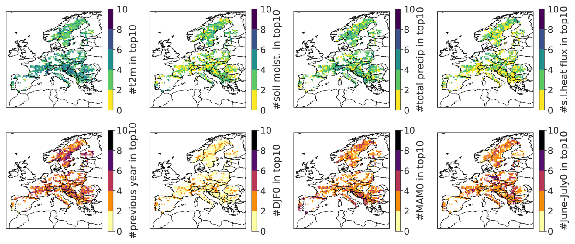 Figure 6Spatial distribution of the relative importance of predictor types across Europe. At each grid point, the color indicates the number of times specific features appear among the top 10 most important predictors for forest browning. The top row shows meteorological variables (from left to right): 2 m temperature, soil moisture (28–100 cm), total precipitation, and surface latent heat flux. The bottom row displays temporal features (from left to right): seasonal averages from the previous year (DJF, MAM, JJA, SON), DJF of the current year, MAM of the current year, and June–July of the current year.