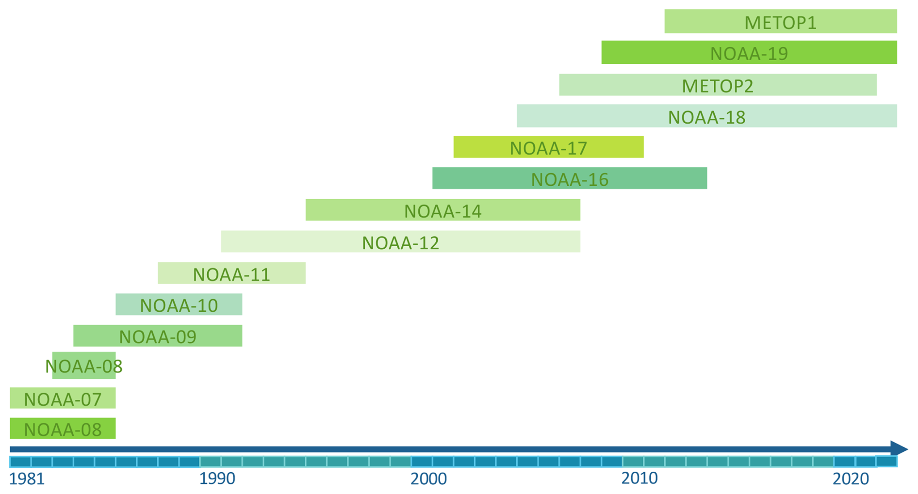 We use the NDVI 10 d composite dataset generated from the AVHRR LAC data (Dupuis et al.2024; Barben et al.2024; Weber et al.2021). This dataset is archived at the University of Bern, Switzerland, and contains data from the AVHRR sensors from the NOAA and Metop satellite series (MetOp1, MetOp2, and MetOp3). The NDVI compositing is generated by retaining the 10 d median value of NDVI (Asam et al.2023). Prior to that, the dataset was orthorectified, radiometrically calibrated, and filtered for clouds, and the NDVI values were spectrally corrected for the different versions of the AVHRR instrument (see Appendix A for further details). The advantage of using the AVHRR dataset over Europe is the long period of data availability, from 1981 to 2022, and the good trade-off between temporal resolution (10 d) and spatial resolution (0.01° N × 0.01° W, corresponding to an effective footprint of approximately 1 km2). We discarded NOAA-15 due to poor data quality and MetOp3 due to the absence of specific correction coefficients for the spectral response function (see Fig. A1 in Appendix A for the time distribution of the satellites used). As several platforms (NOAA-6 to -18 and the MetOp-series) may be available for a given 10 d composite, we selected the maximum NDVI value among the MED (10 d median value composite) NDVI values to obtain a single time series. Selecting the maximum among the MED diminishes the impact of potential disturbances such as clouds, snow, and aerosols, which tend to lower NDVI values (Holben1986; Cihlar et al.1994).
