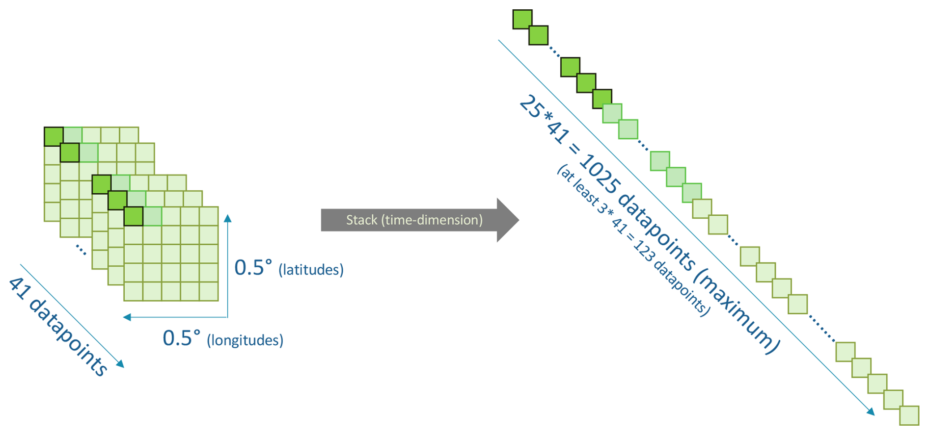 The binary forest browning, our predictand, is a time series of 41 data points between 1981 and 2022, which is too short for a robust estimation of the statistical link between predictors and predictand. Therefore, we artificially create longer time series using the large amount of available spatial data. The 25 time series of GPs located in the same 0.5° × 0.5° grid box are stacked temporally by assuming that hydro-meteorological conditions triggering browning are the same for neighboring GPs (see Fig. C2 in the Appendix). We thereby obtain longer time series, up to 1025 data points (25 × 41) for each sub-region. Note that 1025 is the maximum length, which is obtained only if the 25 GPs are forest GPs (as defined in Sect. 2.2), with sufficient data quality for every summer (as specified in Sects. 2.1 and 2.2). For a robust statistical fitting, we discard stacked, balanced time series shorter than 80 data points (i.e., 0.5° × 0.5° boxes comprising less than two 0.1° × 0.1° forest GPs).