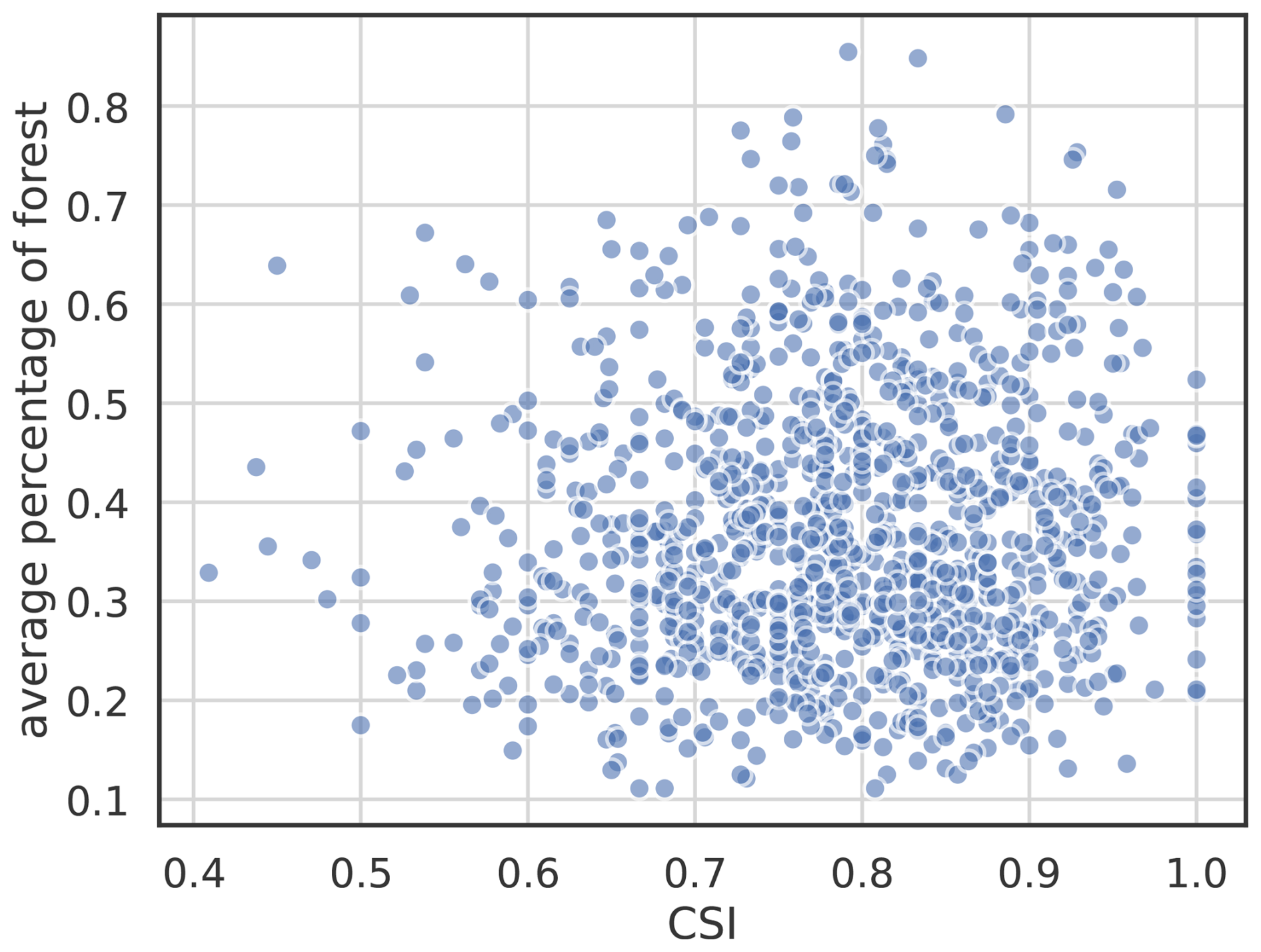 We measure the skill of the RF model applied to the testing data with the critical success index (CSI; Schaefer1990). The CSI is defined as CSI=TPTP+FP+FN, where TP is the number of true positives (successfully predicted and observed low greenness events, Yt=1), FP is the number of false positives (i.e., false alarms, the model incorrectly predicted a low greenness event) and FN is the number of false negatives (i.e., missed events, the model erroneously predicted Yt=0). The CSI focuses on the predictive skill of the low greenness events, which is the quantity of interest in our analysis. The accurately predicted normal years (Yt=0) are not considered. The CSI varies between 0 and 1, where a higher value indicates a better forecast. A CSI of 0.5 means that the model predicted as many TP as the sum of FP and FN.