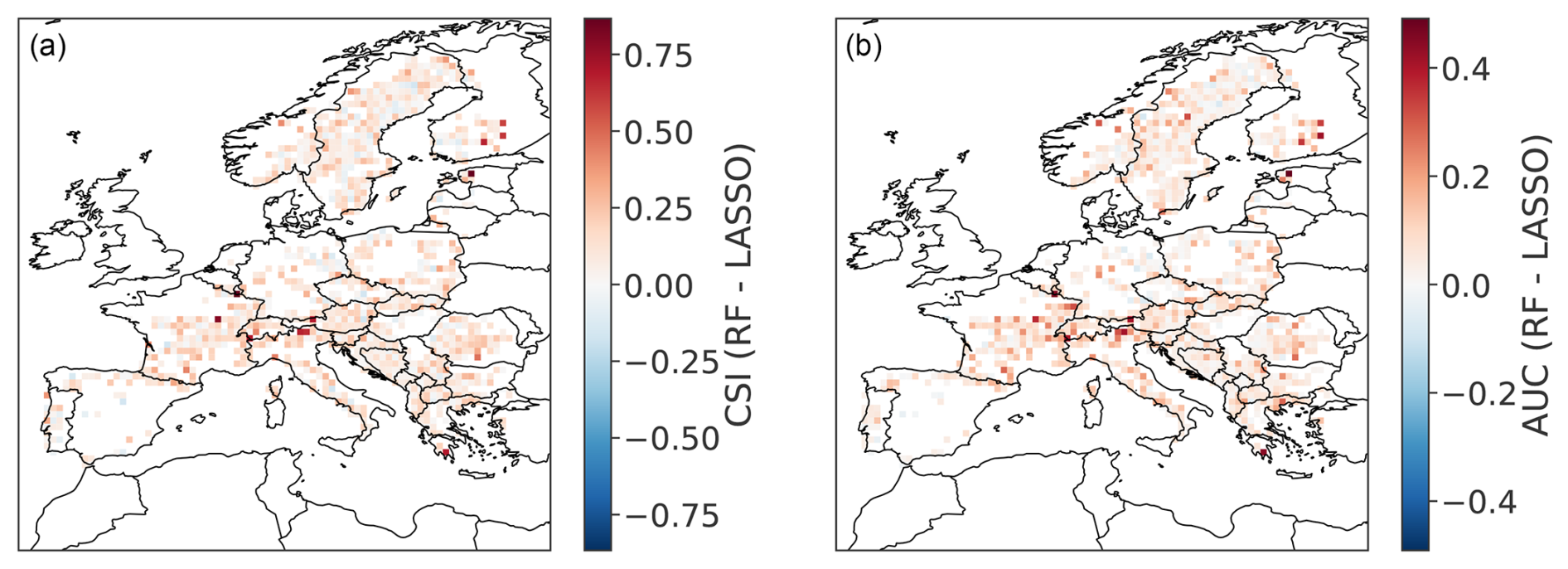 In comparison to the RF, the LASSO model exhibits a lower CSI for 83 % of the GPs, and a lower AUC for 89 % of the GPs (see Figs. E1 and E2 in Appendix). Only 92 % of the GPs exhibit a CSI greater than 0.5 for the LASSO model (99 % for RF). For the LASSO model, 45 % of the GPs attain an AUC above 0.9 (82 % for RF). An advantage of the LASSO logistic regression is the simple, linear link between predictors and predictand. This simplified link is outperformed by the RF model, allowing for flexible non-linear relationships between predictors and predictand.