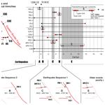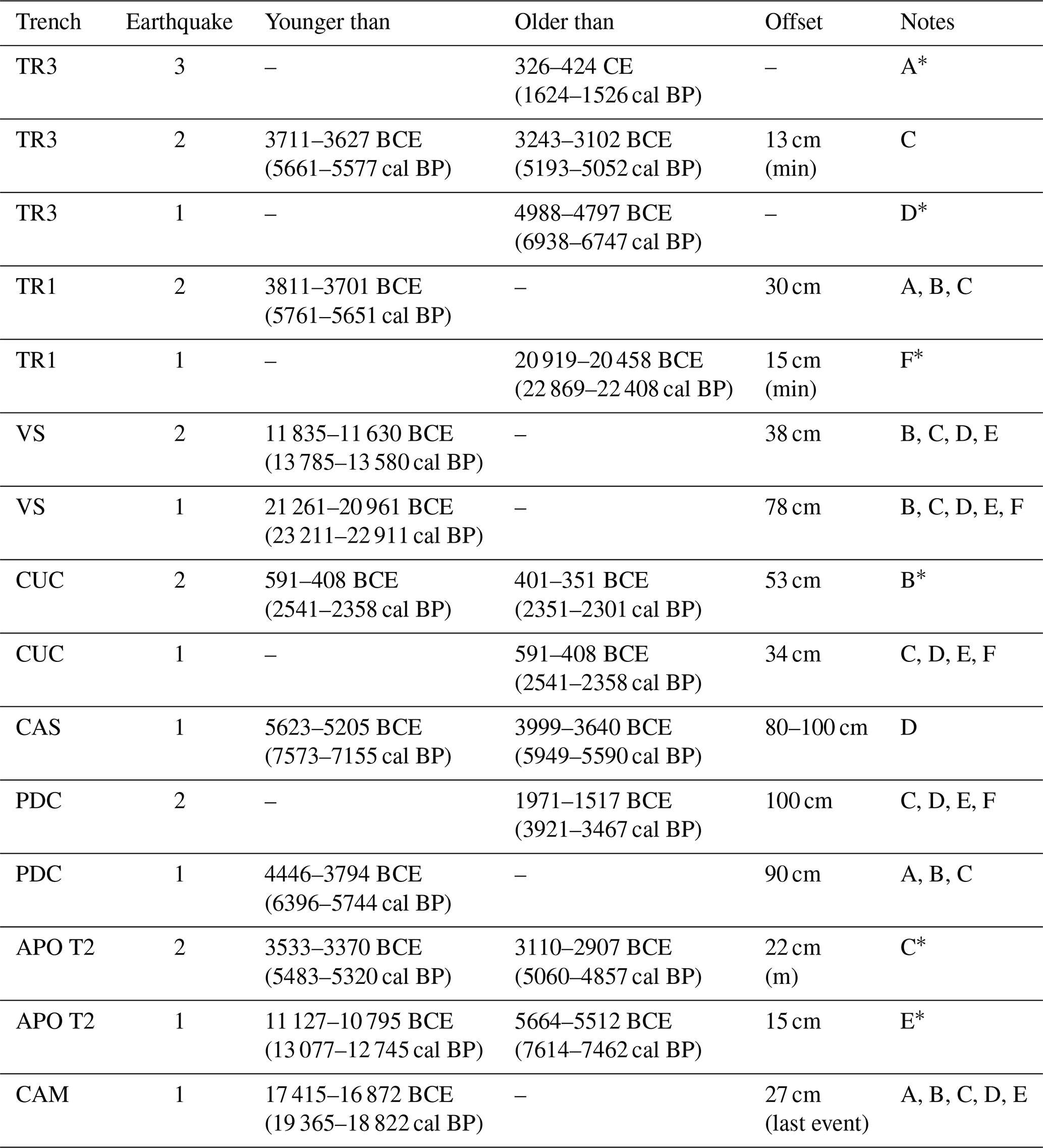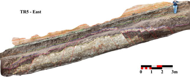 In the lower wall of the trench, the fault brings Unit 11 in contact with a colluvium (Unit 6) which, due to its geometry, we interpret as a colluvial wedge. This colluvial wedge returned a calibrated age of 20 919–20 458 BCE (Sample C05) and, considering its thickness, it is possible to estimate a surface dislocation of at least 15 cm necessary for it to be deposited. This event occurred just before the deposition of the colluvial wedge, then before 20 919–20 458 BCE (event TR1-1 in Fig. 15).