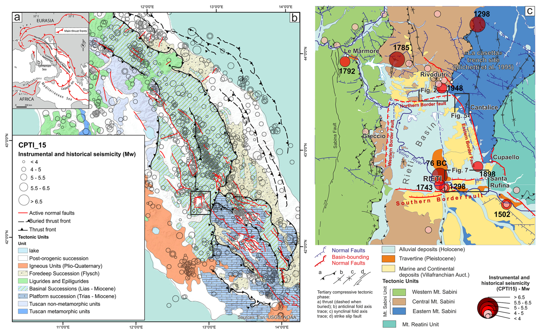 Several moderate historical earthquakes hit the area during the last 3 centuries (Fig. 1c; Rovida et al., 2022). The 9 October 1785 (Mw 5.76; Io VIII–IX MCS) hit to the northwest of the area. Two relatively recent moderate earthquakes occurred near the N and S border faults, which we investigated with exploratory trenches (Fig. 1c). The one to the south is the 27 June 1898, Santa Rufina event (Mw 5.5; Io VIII–IX MCS; Comerci et al., 2003) whose causative fault, based on the epicentral area, could be either the eastern boundary fault or the southern boundary fault of the basin. A similar size earthquake hit the NE border of the basin near Rivodutri on 31 December 1948 (Mw 5.3; Io VIII MCS; Bernardini et al., 2013).