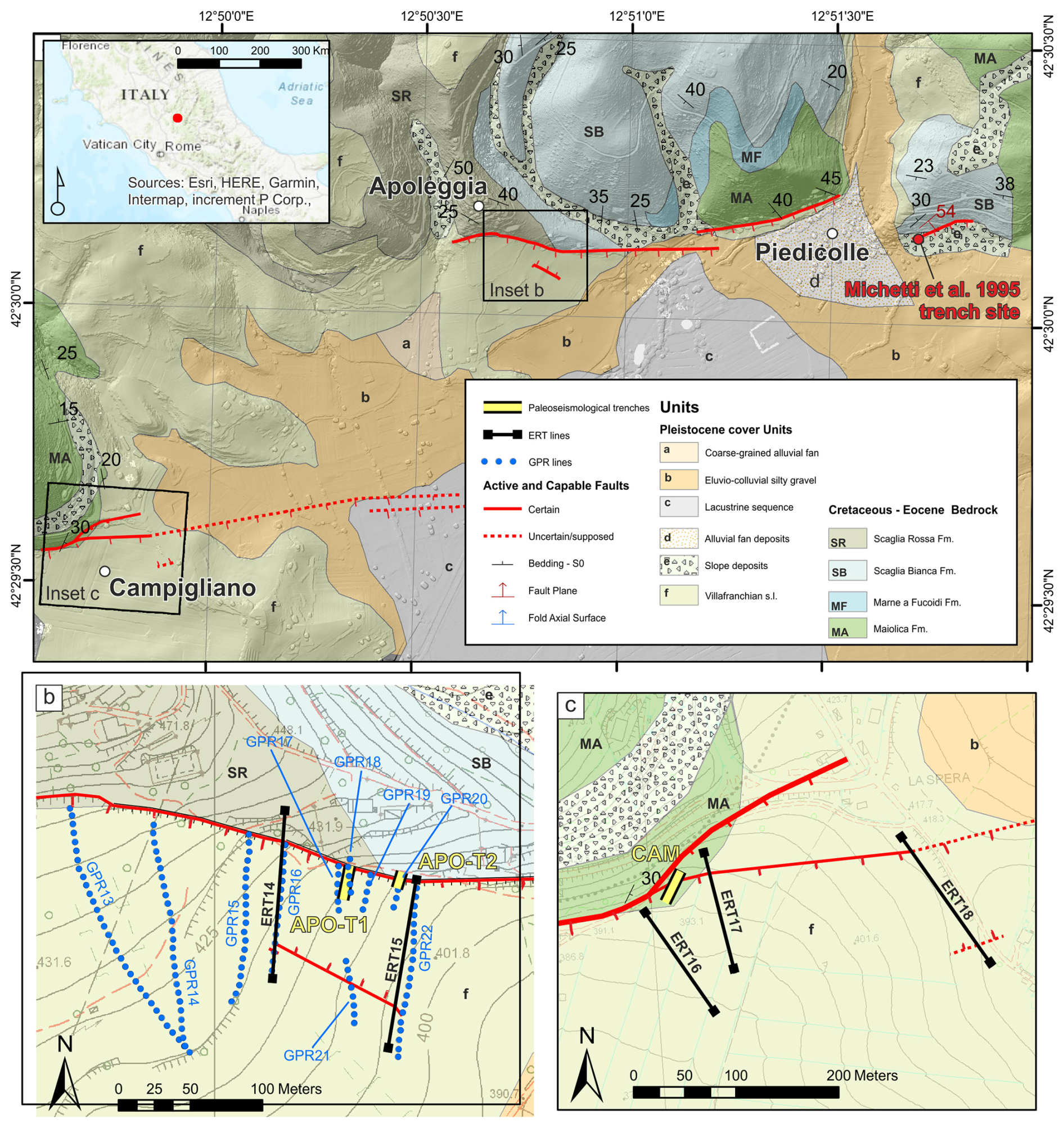 The northern area includes two Sectors of investigation: Campigliano Sector, to the west and Piedicolle/Apoleggia Sector, to the east (Fig. 2a). We excavated 4 exploratory trenches in the Piedicolle/Apoleggia Sector, and one trench in the Campigliano Sector. In the following, we present results from two paleoseismological trenches at the Apoleggia Sector (APO-T1 and APO-T2; Fig. 2b) and one in the Campigliano Sector (CAM; Fig. 2c).