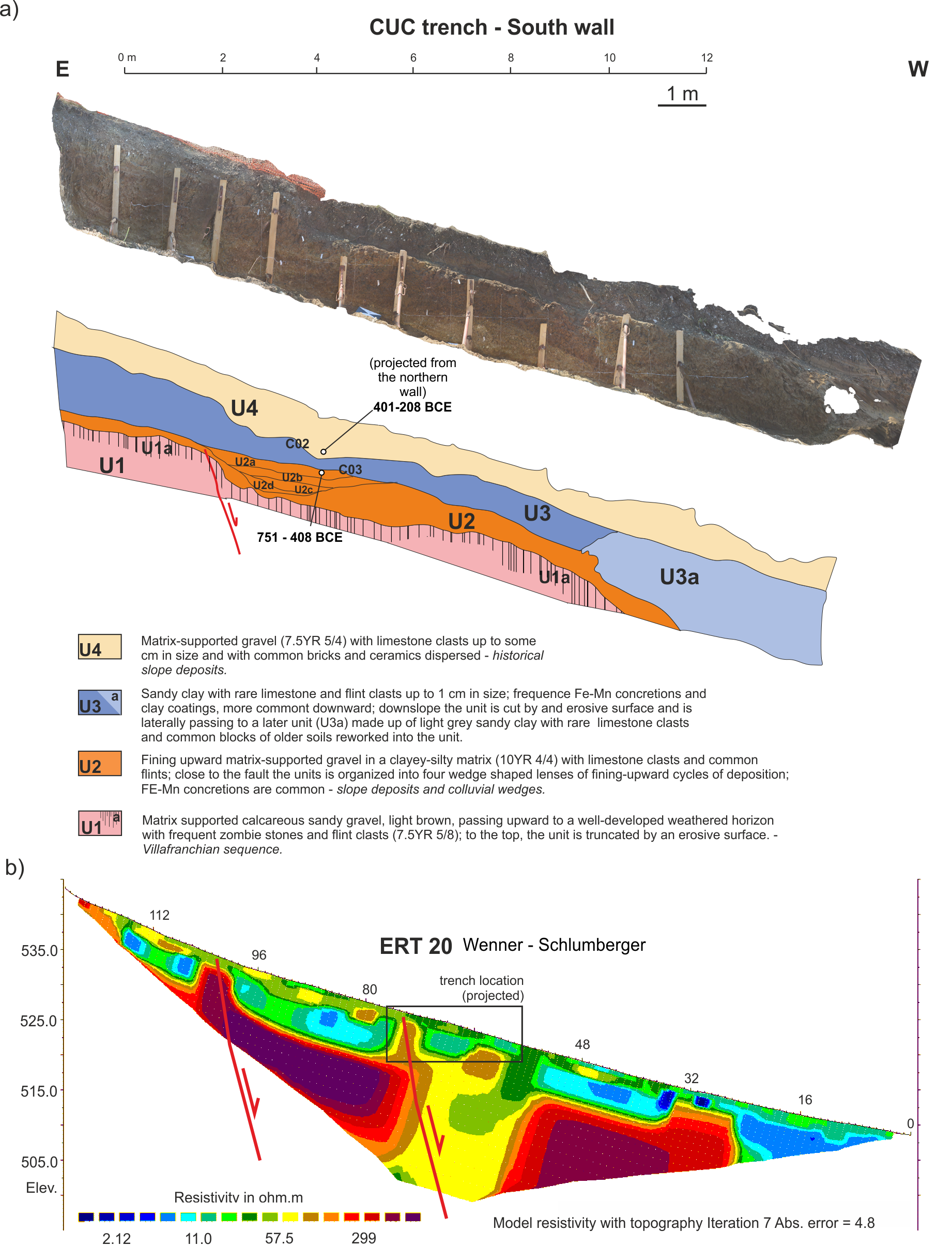 Figure 6Paleoseismological trench and investigations at the Sector 1 of the Eastern Border Fault (a) CUC trench, no vertical exaggeration (southern wall; the footprint in Fig. 5b; for details on the cal age determinations see Table 1); (b) Wenner–Schlumberger ERT survey (see trace in Fig. 5b), the location of the CUC trench (projected) is indicated.