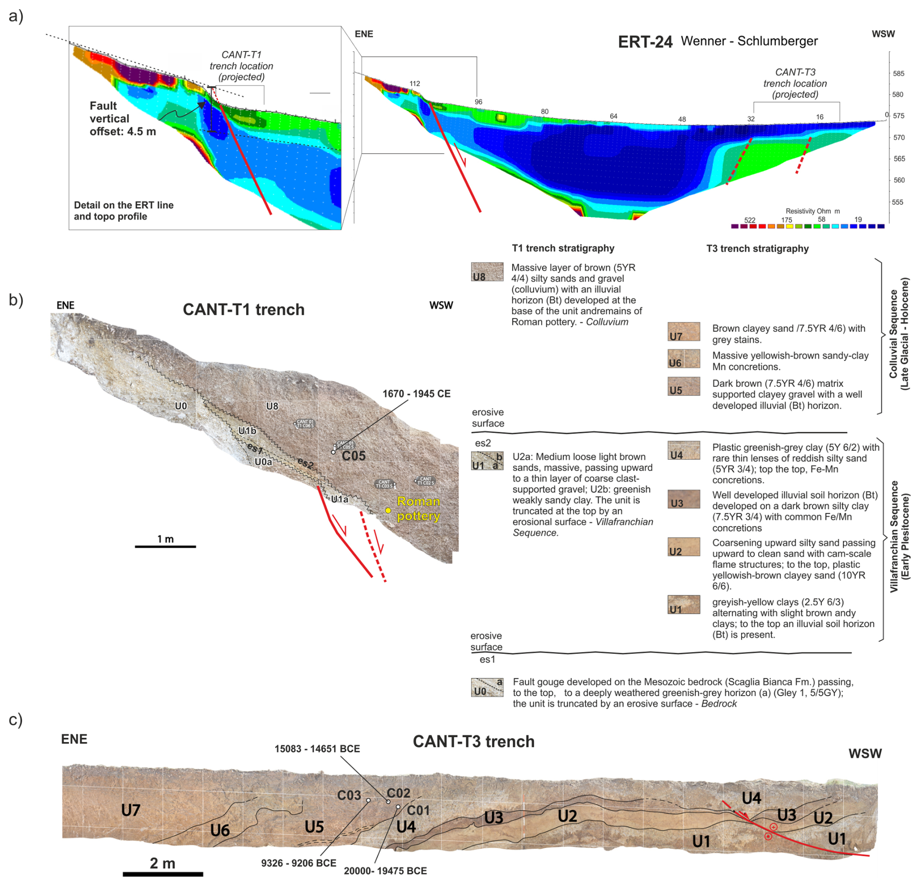 Trench CANT-T3 exposes a sequence of Villafranchian units (U1 to U4; Fig. 7c), overlain by a sequence of colluvial beds with intercalated paleosol horizons. The units are involved in a set of asymmetric folds, which we interpret to be related to underlying blind normal faulting, based on the features of the ERT-24 line described above. Dated samples in the colluvial units indicate a Late Glacial to Holocene age. The colluvial beds, steeply dipping toward the mountain front, constitute the syn-growth sedimentation of the graben-structure with a contemporary infilling of the subsiding block. To the WSW, the trench also exposes a secondary normal fault in the Villafranchian Sequence, dipping to the SSE, crosscut almost along strike by our trench, and testifying to complex deformation and hanging wall release faulting in the graben block.