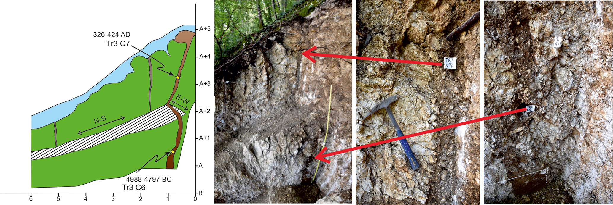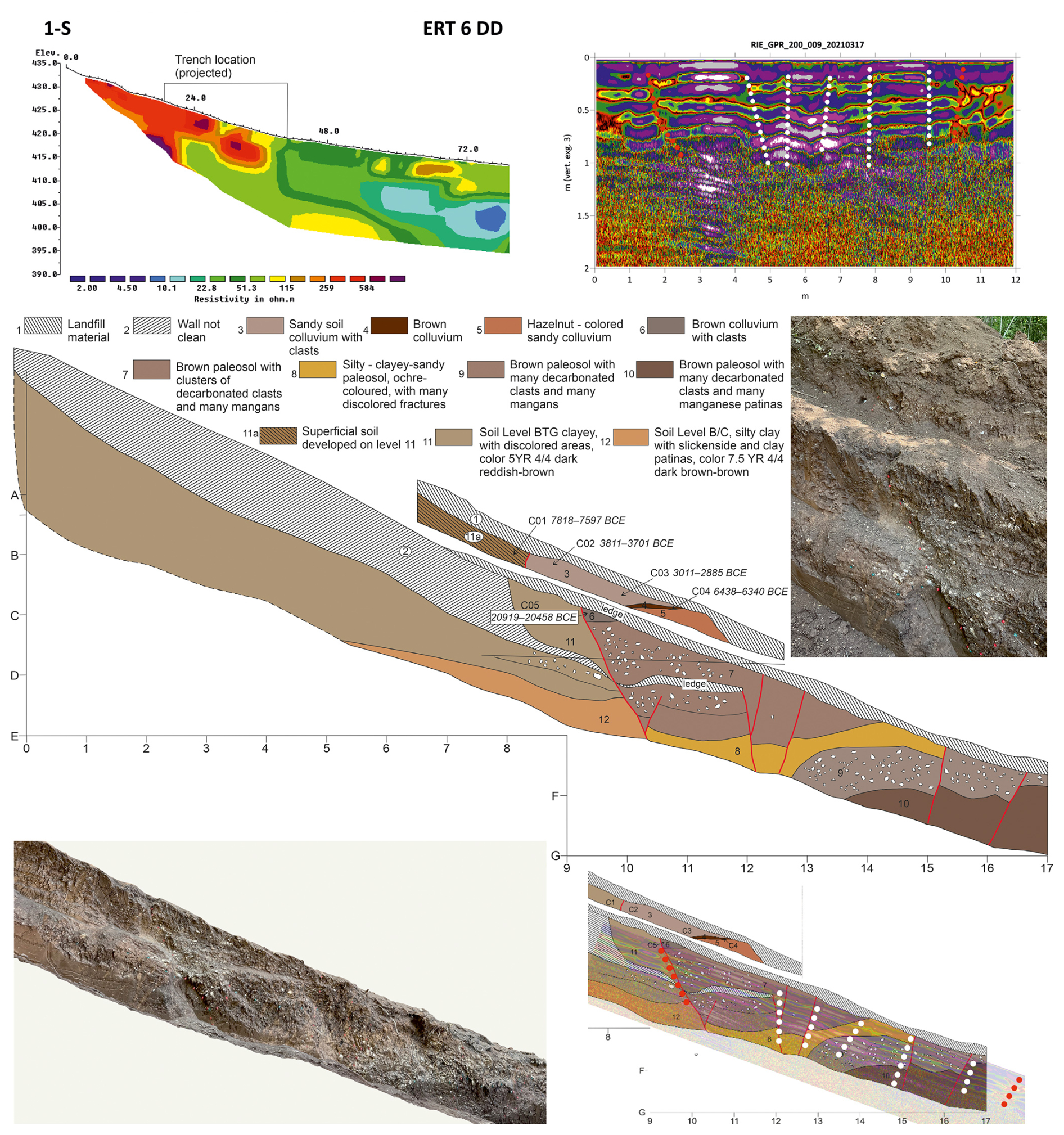We selected the location of the trench TR3 based on geological and geomorphological evidence, without carrying out geophysical investigations. It was dug at the main slope break on the northern slope of the Castellaccio relief (Fig. 8d).