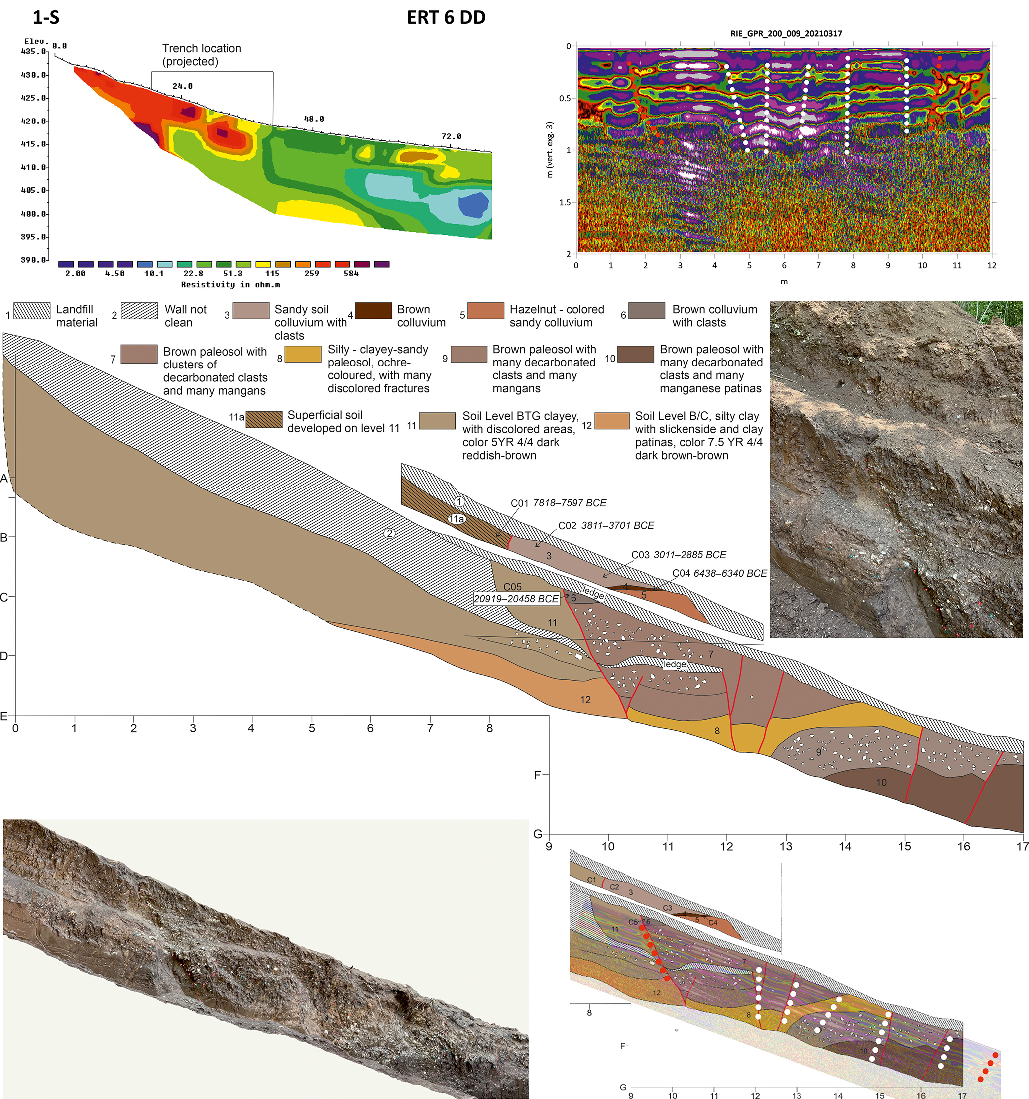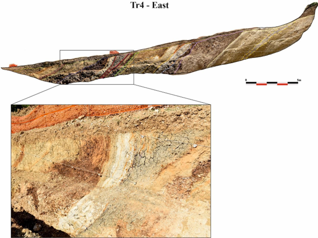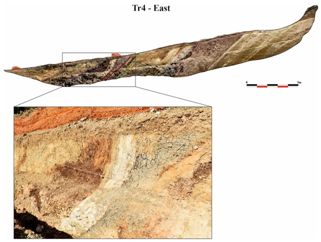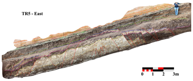 We excavated the Villa Stoli South trench for a length of 40 m, a depth of about 2 m and a width of 1 m. In the uphill, S part of the trench, we uncovered three major discontinuities, which were also detected by the ERT 02 survey. Figure 11 shows the stratigraphic log with tectonic elements.