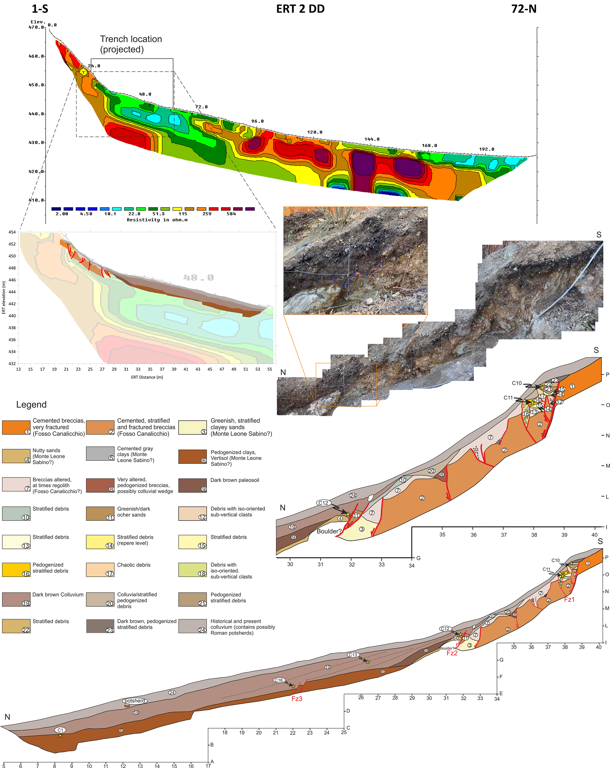 Figure 11Southern Border Fault, investigations at Sector 2 – Villa Stoli; Above: ERT 02 profile; Middle: Photographic mosaic and stratigraphic log of the southern and upper part (first 10 m) of the E wall of the Villa Stoli Sud trench, including fault zones Fz1 and Fz2, and stratigraphic log superimposed on the southern part of the ERT 02 profile; Below: Stratigraphic log of the whole Villa Stoli South eastern trench wall.