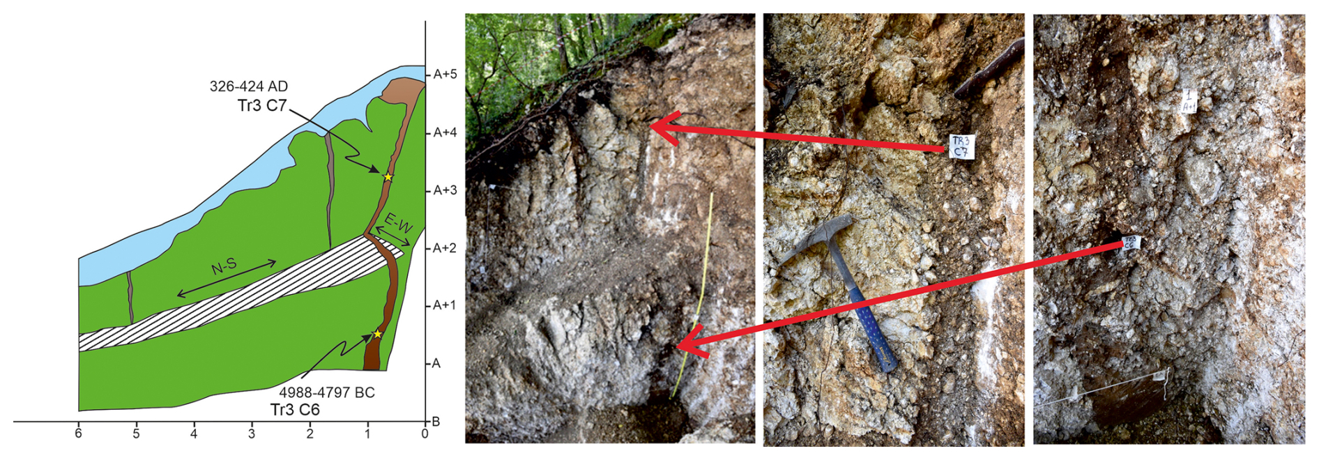 We identified another fault zone (FZ3) 10 m further downhill, toward the north. This fault offsets the interface between the soil colluvium (Unit 19) and the pedogenized clay-rich horizon (Unit 6) with a throw up to 30 cm. The 14C calibrated age of the younger deposits dislocated is 11 835–11 630 BCE (85.0 %; Sample C16). This presumably means that a second seismic event occurred after this date.