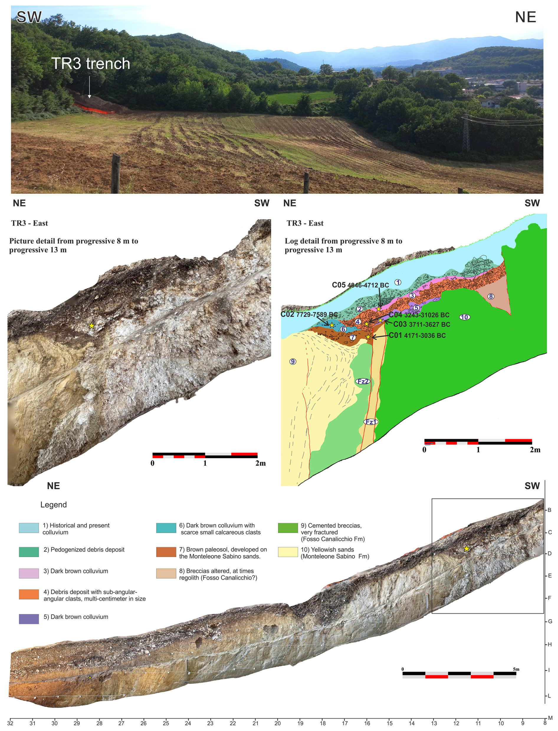 In the upper wall of the trench, this fault brings in contact the pedogenized Monteleone Sabino Synthem, here characterized by a recent superficial soil horizon (indicated as Unit 11a), with a soil colluvium (Unit 3). The calibrated age of the faulted units provided age ranges of 7818–7597 BCE (Sample C01, Table 1) and 3811–3701 BCE (Sample C02), respectively. This means that a surface faulting event occurred after 3811–3701 BCE (event TR1-2 in Fig. 15).