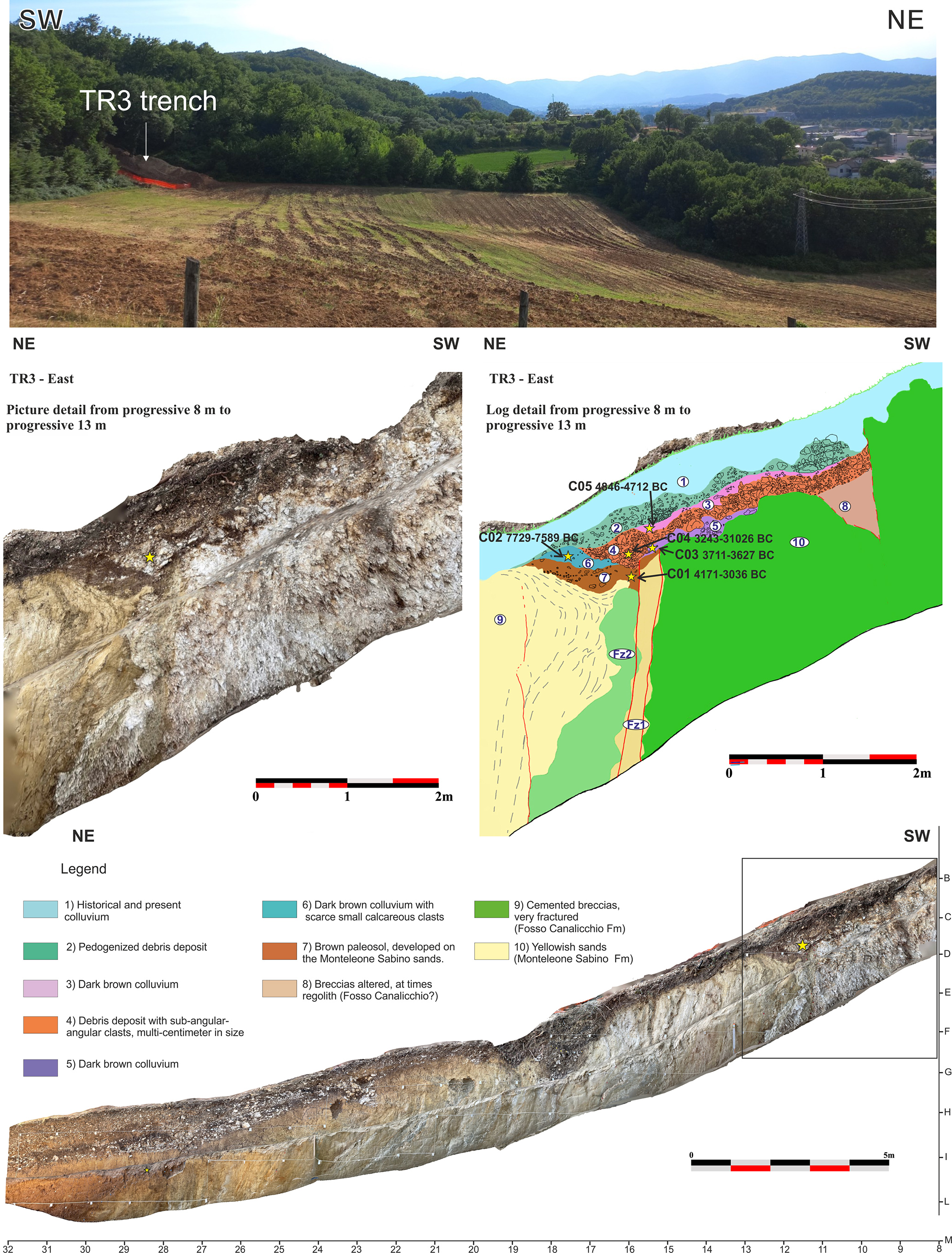 The excavation began where a fault outcrops in the cemented breccia of the Fosso Canalicchio Synthem (basal Lower Pleistocene in age), where the trench walls revealed open fractures filled by colluvial deposits. The breccias present sub-angular to angular clasts with generally centimetric up to decimetric diameters. The fracture, visible at progressive 1 m of the E trench wall (Fig. 12), is filled by brown paleosols that were sampled at different depths. The calibrated ages of the lower sample C06 and of the upper sample C07 resulted in 4988–4797 BCE (95.4 %) and in 326–424 CE (78.6 %), respectively. Since the filling of a seismic-induced open fracture supposedly occurs just after the event, an event should be dated just before 326–424 CE and another just before 4988–4797 BCE.