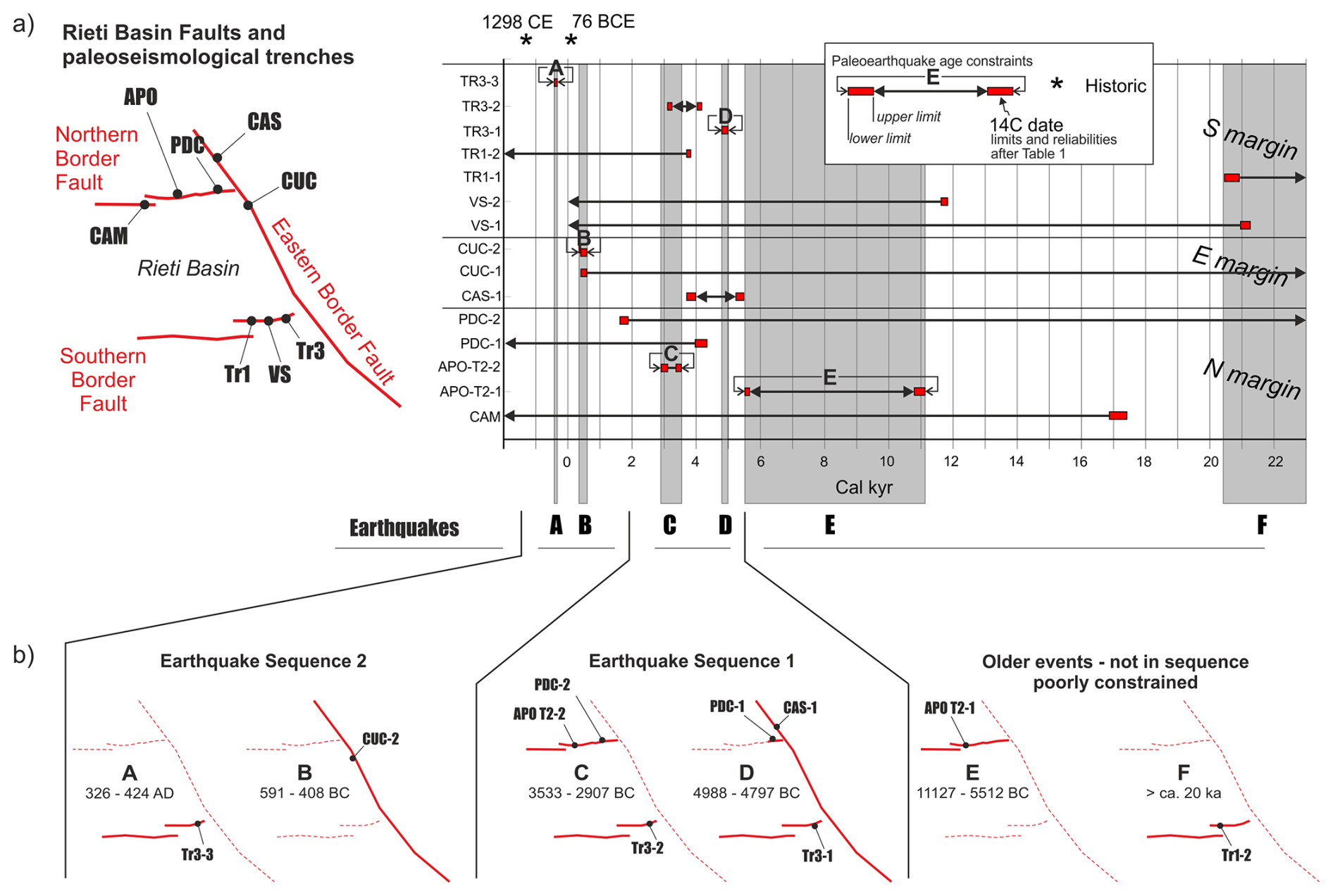 We list the dated samples from the 13 paleoseismological trenches in Table 1, supplemented with the samples collected by Michetti et al. (1995) in the La Casetta, Piedicolle and Caporio Sites. The table presents both uncalibrated determinations and calibrated age. In order to keep the discussion consistent and understandable, when the probability distribution of these calibrated ages shows multiple peaks, in the following we will refer to the central age with the largest probability only (i.e., the one age calibration with highest probability; italicized in Table 1).