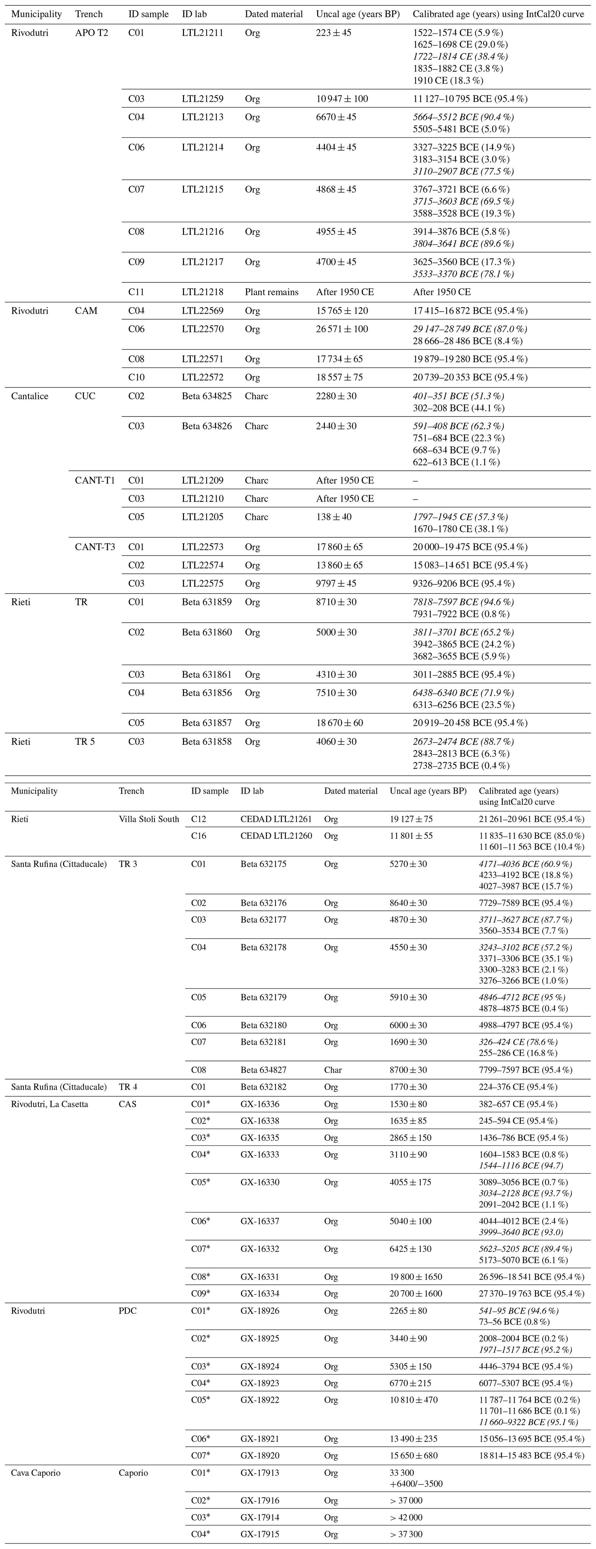 In the three Study Areas, we excavated 17 trenches, 13 of them suitable for paleoseismological analyses. We collected 52 samples for AMS dating, 21 from Rivodutri Municipality, 14 from Cantalice, 8 from Rieti and 9 from Santa Rufina (Cittaducale). We mapped the position of the samples on the trench logs, while Table 1 shows a summary of all the dated samples. The samples were analyzed by specialist laboratories (Beta Analytic and CEDAD); calibration was performed with the INTCAL20 curve using the OxCal ver 3.10 or the BetaCal4.20 software (CEDAD and Beta samples, respectively).