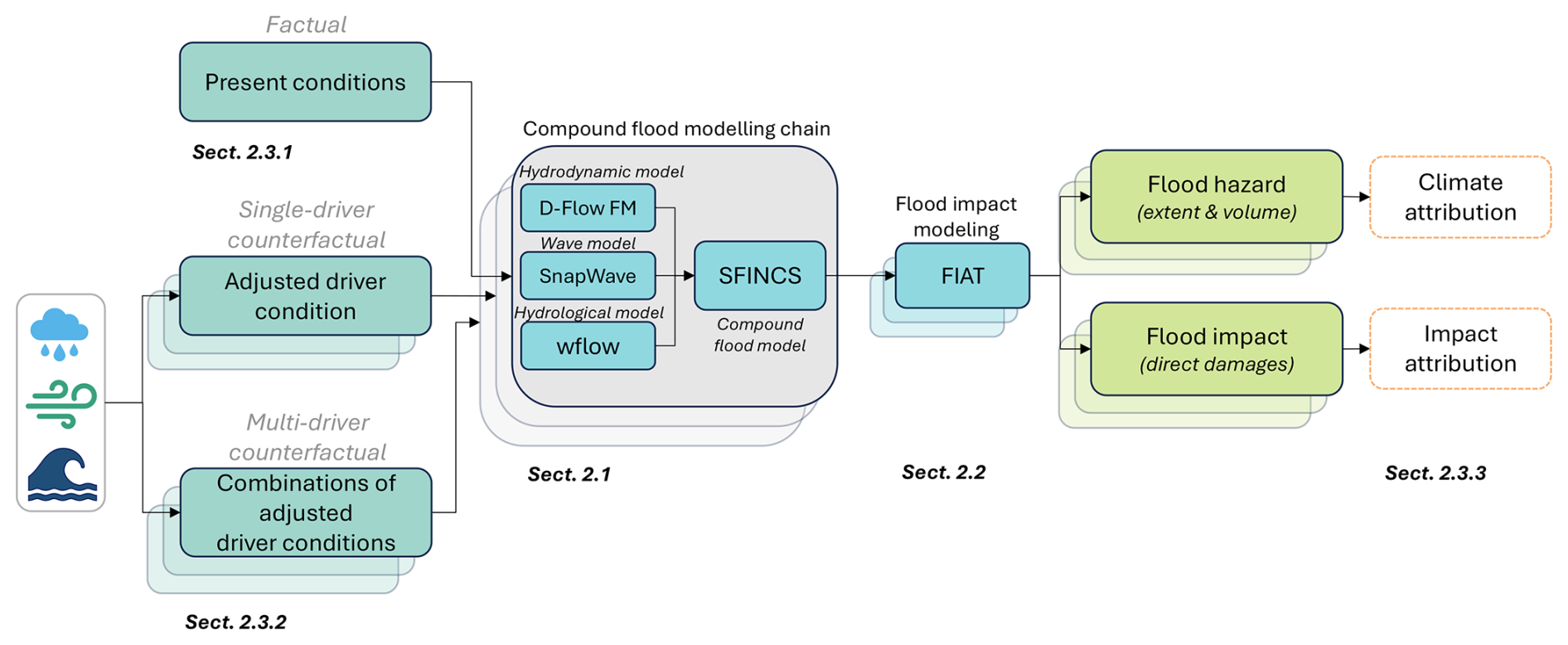 The attribution framework (Fig. 1) for TC Idai (simulated for 9 to 25 March 2019) consists of multiple physics-based models for the different flood drivers (Sect. 2.1) and a flood impact model (Sect. 2.2). These models are used to simulate a factual scenario (Sect. 2.3.1) and multiple counterfactual scenarios with the climate change trend removed from rainfall, wind and sea level (Sect. 2.3.2). The factual and counterfactual scenarios are compared in terms of change in flood hazard (volume and extent) and flood impact (direct damage) to determine conditional climate- and impact attribution statements (Sect. 2.3.3). Our entire workflow is built on open-source models and is accessible on GitHub (Vertegaal et al., 2025).