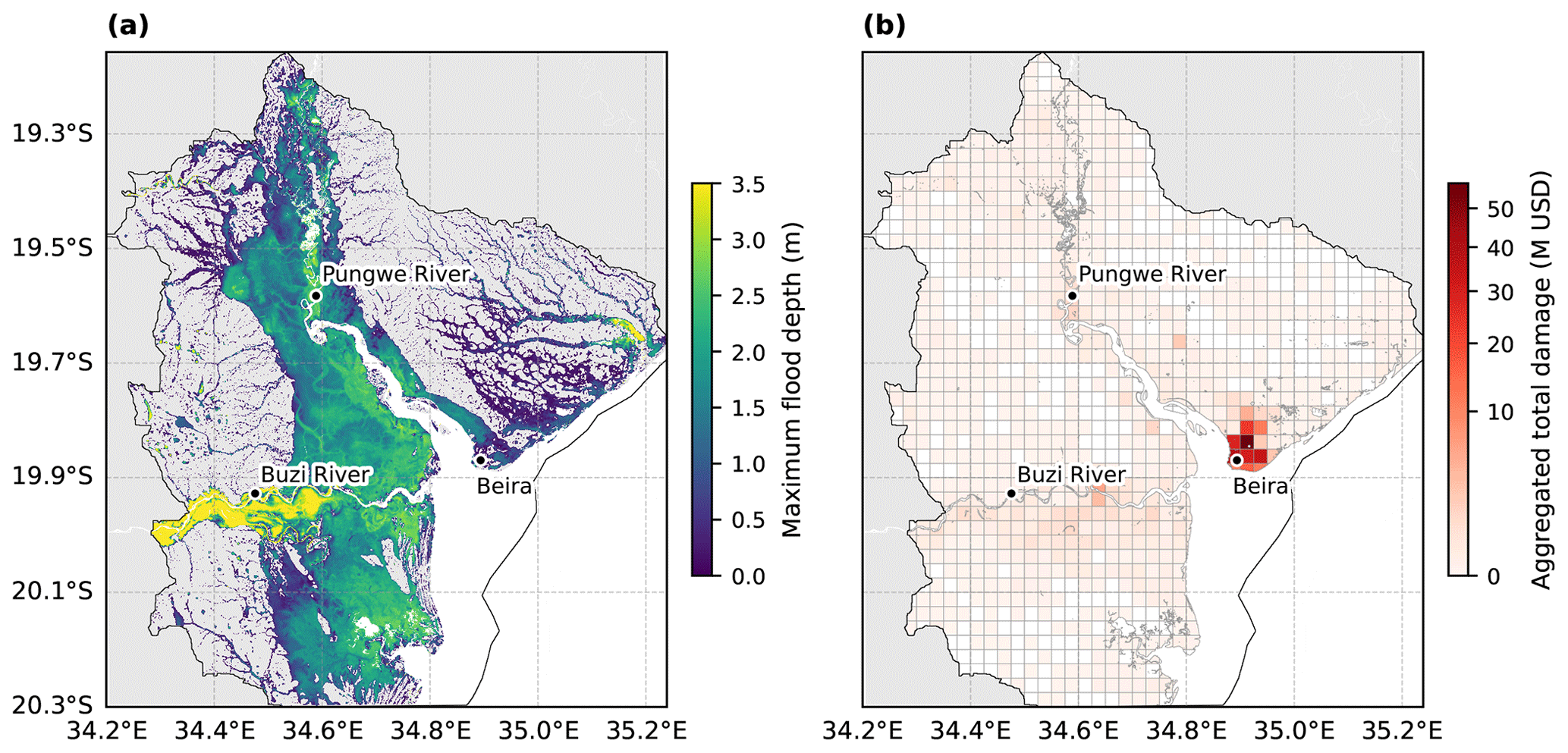 Figure 3Simulated maximum flood depths in m (a), and aggregated (0.025° grid cells) total damage in million (M) USD (b) due to flooding for the factual scenario of TC Idai. The compound flood model (SFINCS) domain is shown in black.