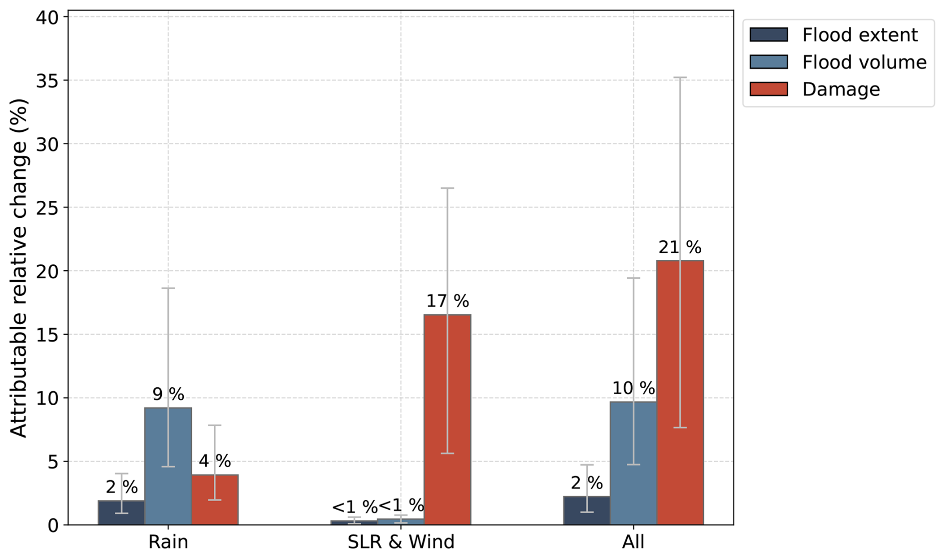 Figure 5The relative change in flood extent (dark blue), flood volume (light blue), and flood damage (red) due to climate change, driven by different flood drivers where “All” includes SLR, wind and rain. The bars present the medium counterfactual scenario, and the error bars present the low and high counterfactual scenarios. The relative change in flooding and impact is calculated by applying Eq. (1) (Sect. 2.3.3).