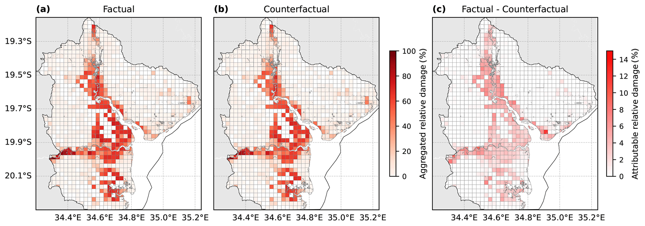 Figure 6The aggregated (0.025° grid cells) relative damage (damaged fraction of total asset value) for the factual (a) and medium counterfactual (b) scenarios with all drivers combined, and the absolute difference (factual – medium counterfactual scenario) attributable to climate change (c). The compound flood model (SFINCS) domain is shown in black.