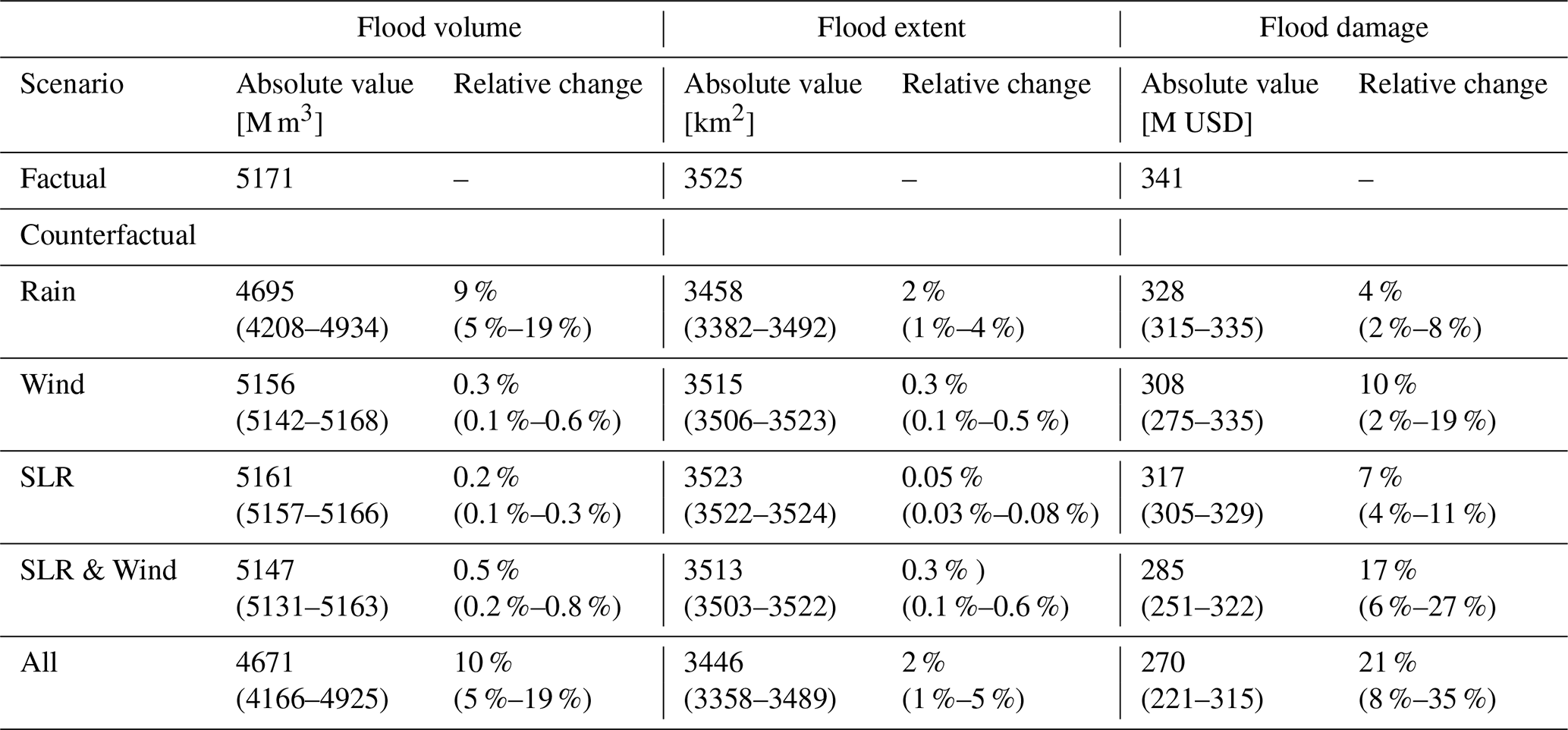 Table 2The absolute and relative change in flood volume, flood extent and flood damage for factual (absolute values only) and medium counterfactual scenarios (low–high counterfactual scenarios in parentheses). The relative change in flooding and impact that is attributable to climate change is calculated by applying Eq. (1). Decimals are presented for values below 1.