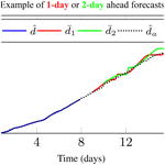 The proposed scheme works on the principle of prediction followed by correction of the information of interest, i.e., at each time step, information is predicted for the next time step and then corrected based on the measurements. An approach to extend the prediction horizon over more time steps is also presented. To illustrate this extended scheme, two different prediction horizons are chosen (one day and two days). As the dynamics of time-varying parameters are unknown, they are assumed constant for the prediction horizon. As new measurements become available, the correction step takes place, and with these corrected parameters, displacement and parameters are again predicted for the respective prediction horizon. The obtained performances are promising regarding the possibility to use such a forecast for operational predictions.