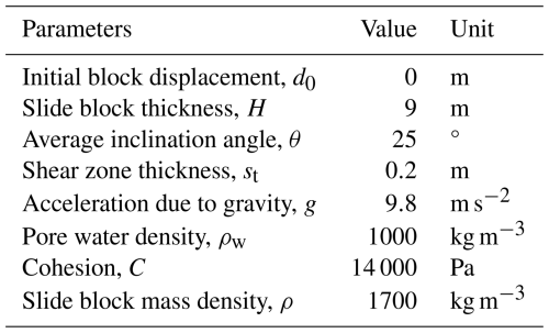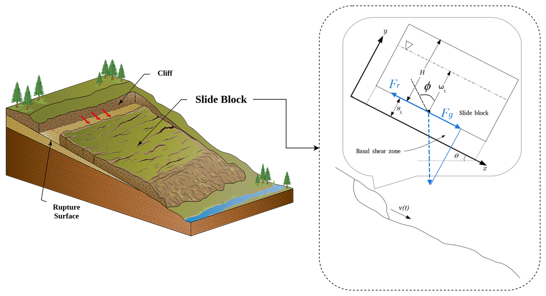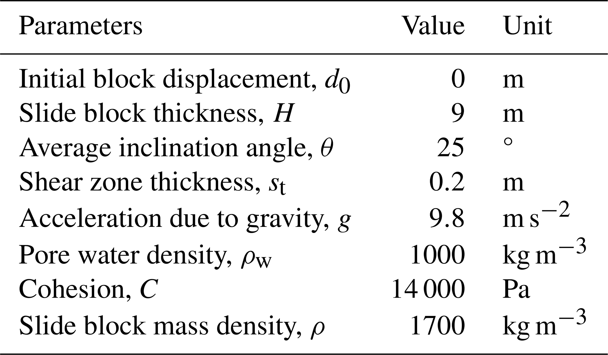 where ρ is the soil density, H is the slide block height, g is the acceleration due to gravity, θ is the inclination angle, p(t) is the basal pore water pressure at time t, v(t) is velocity of the slide block, and st is the basal shear zone thickness. The three mechanical parameters ϕ, C and η denote the friction angle, the cohesion, and the viscosity of the shear zone material, respectively.