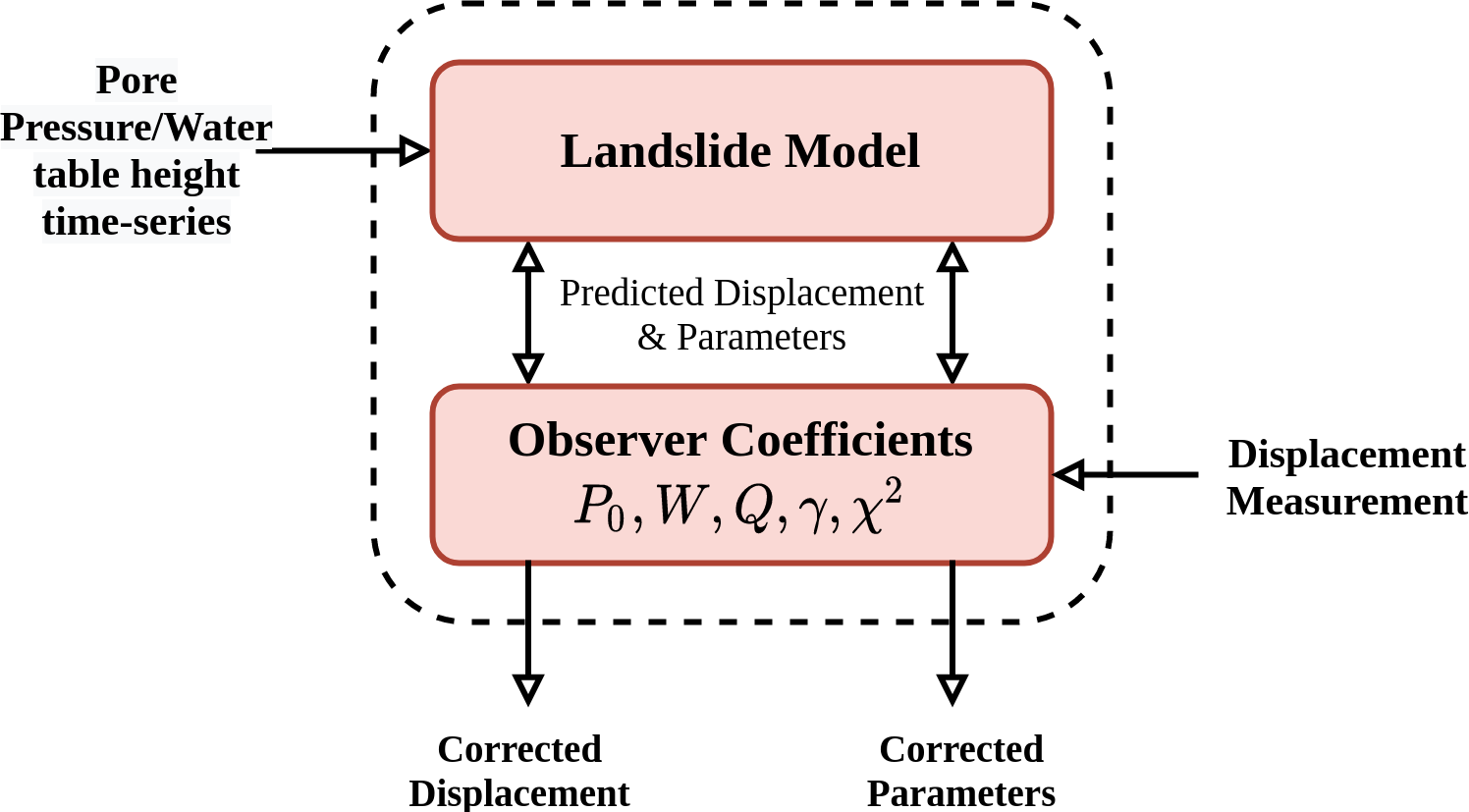 To summarize, the sensitivity to initial conditions and parameters is generally handled by simulating a model iteratively and adjusting the parameter values to obtain consistency with measured data (iterative approach). Alternatively, another efficient approach can be to run a model over time and continually fine-tune the parameters to synchronize with measured data, as in the so-called Kalman filter (or “observer”) approach (Kalman1960) (continuous approach). This second approach is much less common in landslide studies (see e.g. Lu and Zeng2020; Acar et al.2008) and has seldom be used in conjunction with a mechanics-based model. In former studies, we applied both of these approaches to a landslide sliding consolidation model, using synthetically generated data: see Mishra et al. (2020a) for the iterative scheme (adjoint method), and Mishra et al. (2020b) for the continuous scheme (observer design). We found that a continuous scheme can be more suitable for reconstructing time-varying parameters. In addition, Kalman approach has the advantage of providing an optimal filtering solution whenever the model is linear and subject to additive white noises (Anderson and Moore1979). When used with a physical model, it shows powerful prediction capabilities thanks to the feedback connection with real data. Lastly, it also offers tuning parameters to act on the filtering / reconstruction performances.