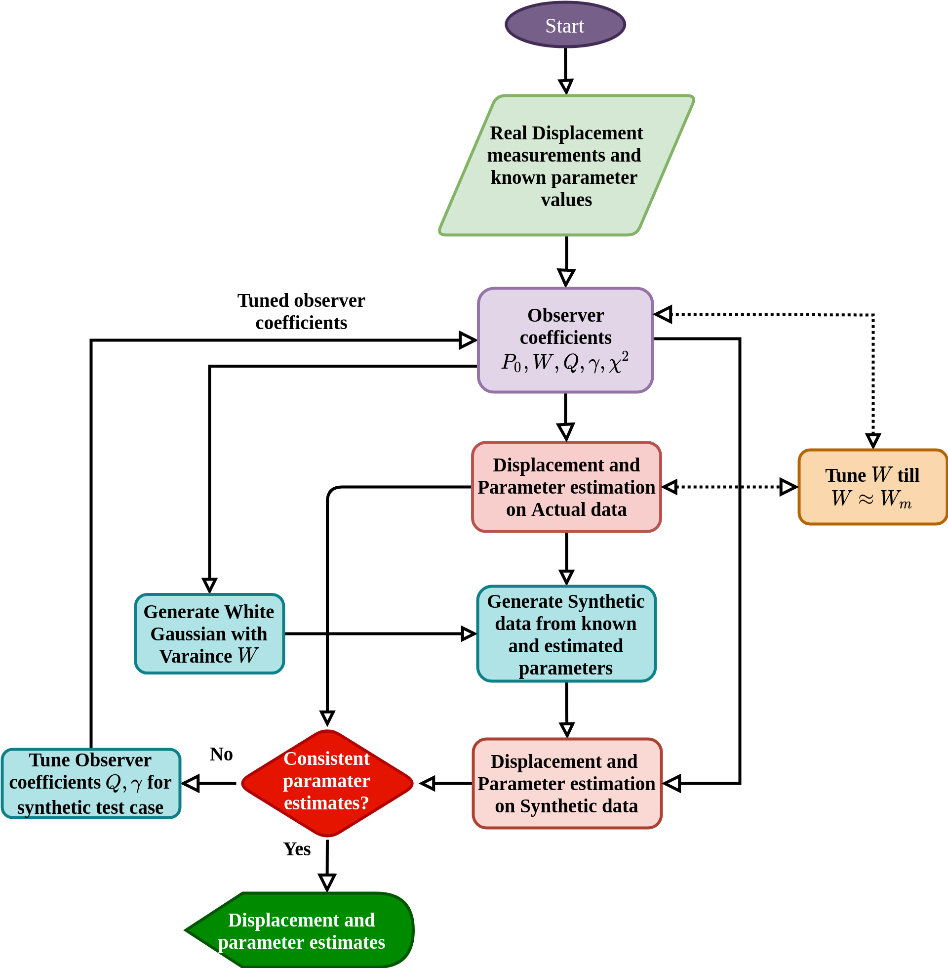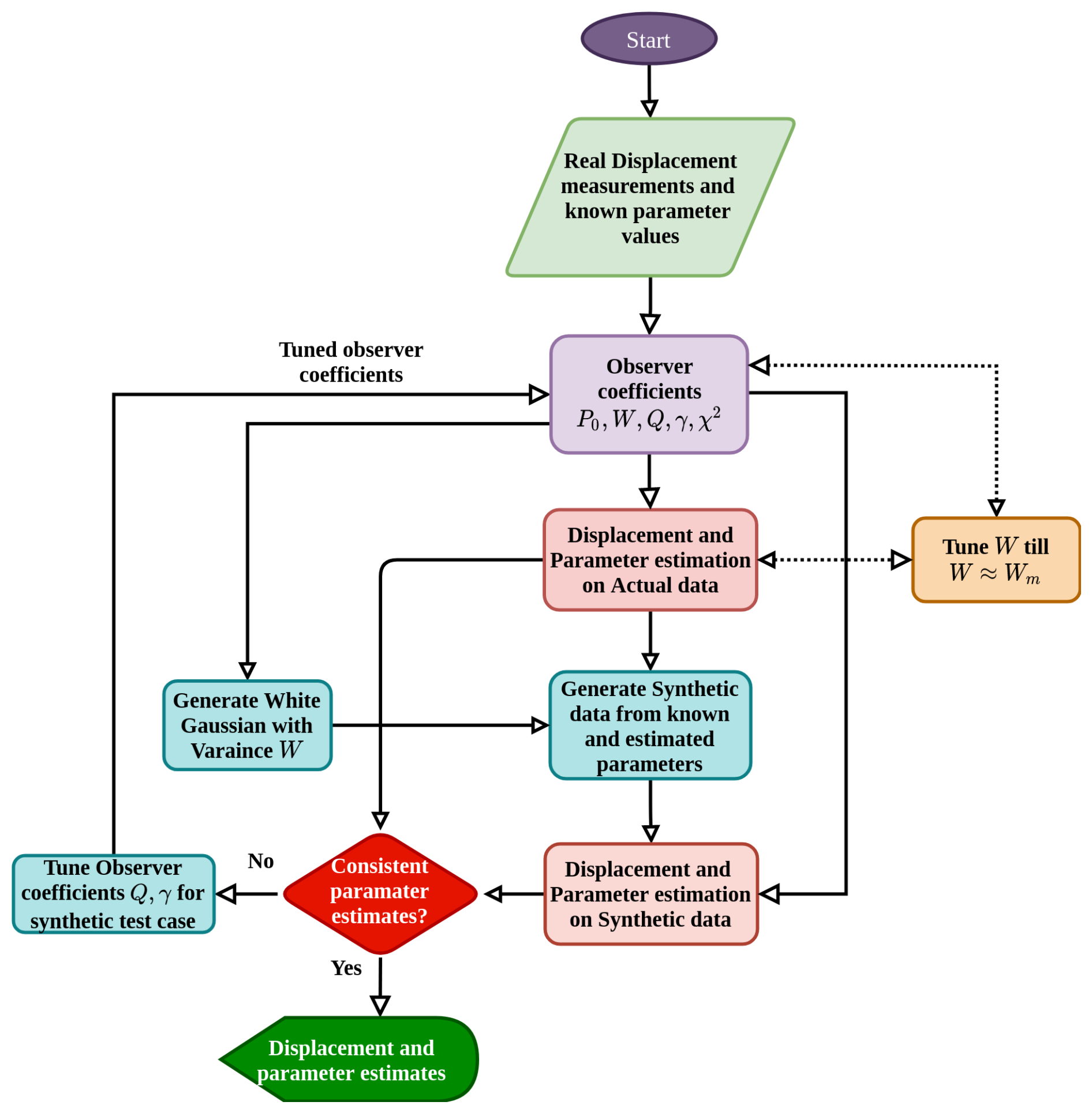 Observer coefficients (P0,W,Q,γ,χ2,m) should be properly chosen to recover model information (see Fig. 2). In usual applications, these coefficients are manually tuned until proper convergence in estimates are obtained. However, such applications require some nominal values of the parameters being known (e.g. Ţiclea and Besançon2009), which is not the case in the present study. Therefore, a novel approach is introduced, which considers both synthetic and actual data cases to verify the estimates, according to the methodology summarized in Fig. 3.