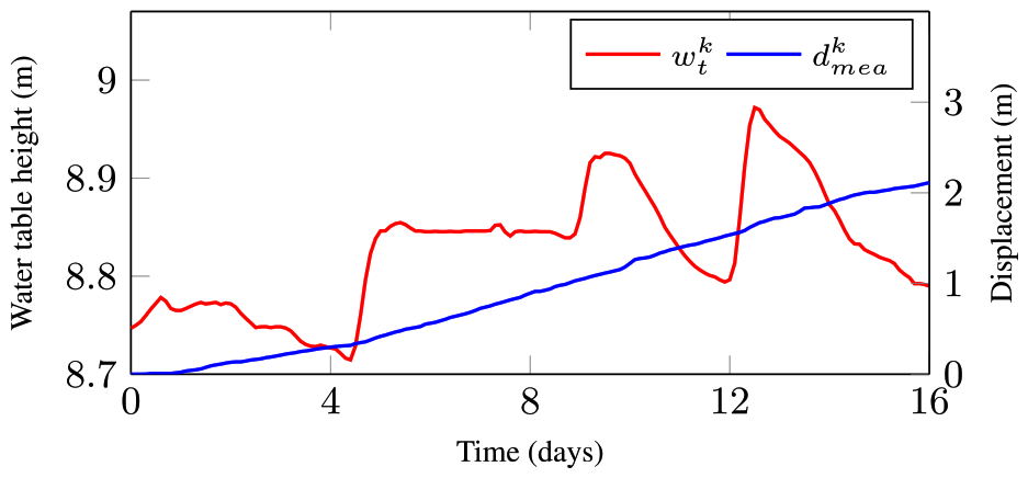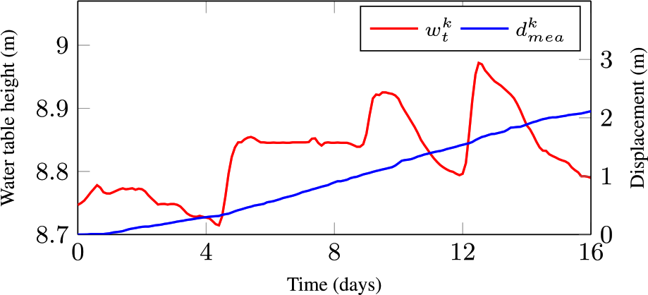 Figure 4Super-Sauze landslide data from 7 to 23 May 1999: Displacement measurement dmeak and reconstructed water table height time-series wtk obtained from Bernardie et al. (2014) (notice that wt is referenced to the base of the sliding block, thus wtk9 m).
