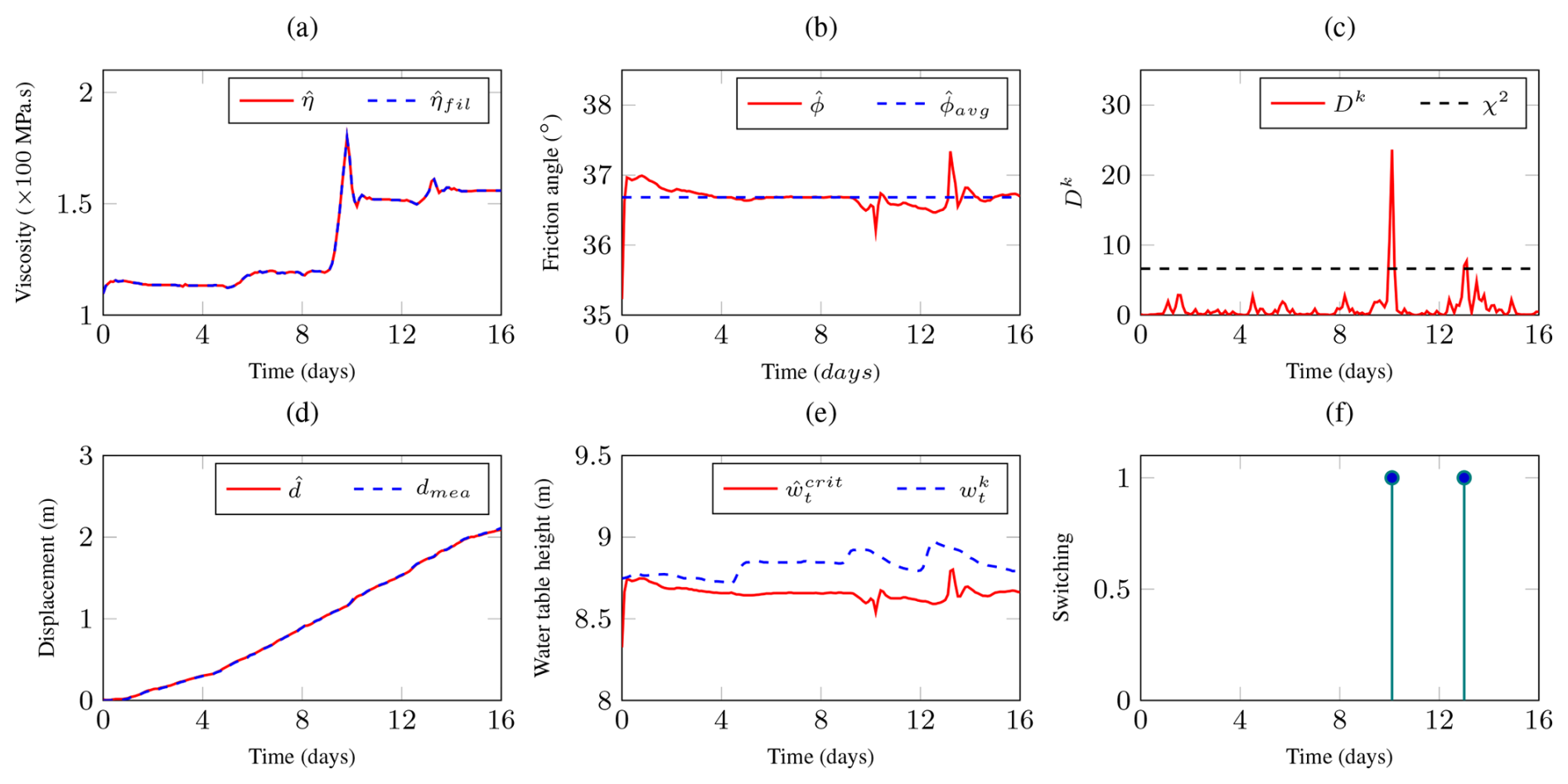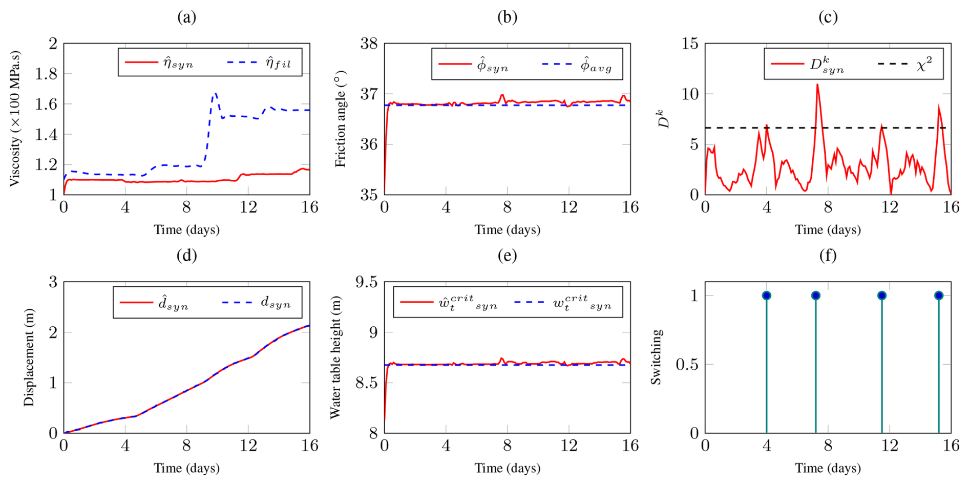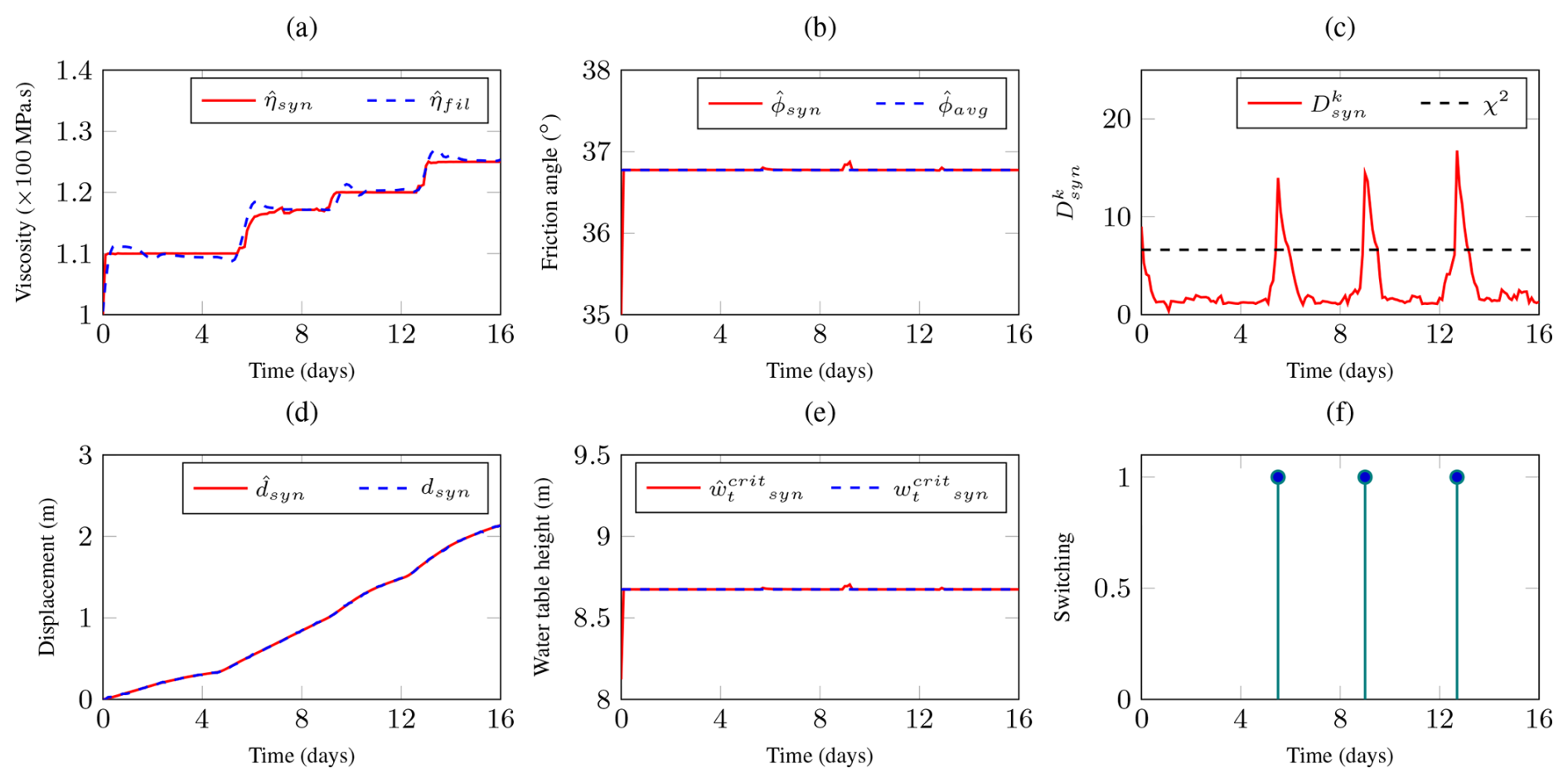 where qk is the parameter of interest (viscosity and friction angle) at time k and q^k is the corresponding estimated parameter. Indicator Iq provides information on how close the estimated parameters are to the parameters used to generate the synthetic test case. The above process of tuning W from actual case, followed by tuning γ and Q on synthetic test cases, is continued until parameter estimates in both cases are consistent to each other, as shown in Fig. 3.
