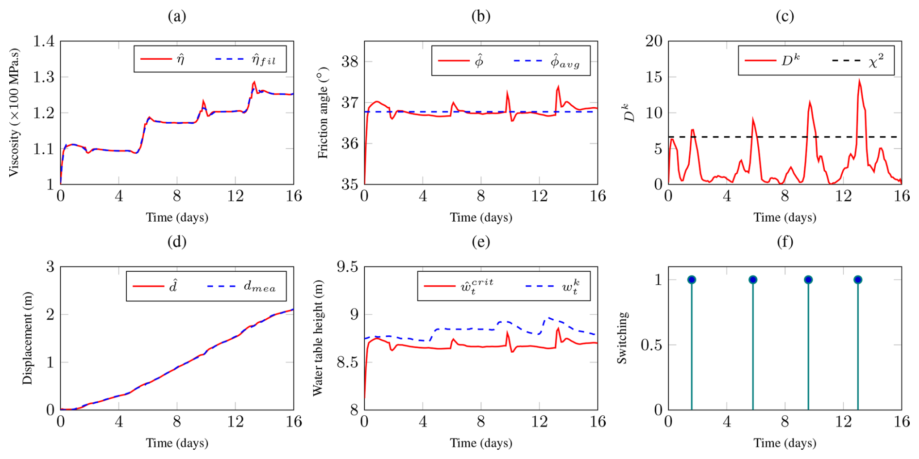 Figure 8Final estimation results for Super-Sauze case with real data and observer coefficient values γ=0.9, W=6×10-5, Q=10-11I3×3: (a)(b) parameter estimates (η^, ϕ^), filtered viscosity ηfil and averaged friction angle ϕavg, (c) Mahalanobis distance between estimated and measured displacement Dk, (d) displacement estimate d^ and displacement measurement dmea, (e) critical water table height estimate w^tcrit and water table height measurement wtk, (f) resetting times of the covariance matrix.