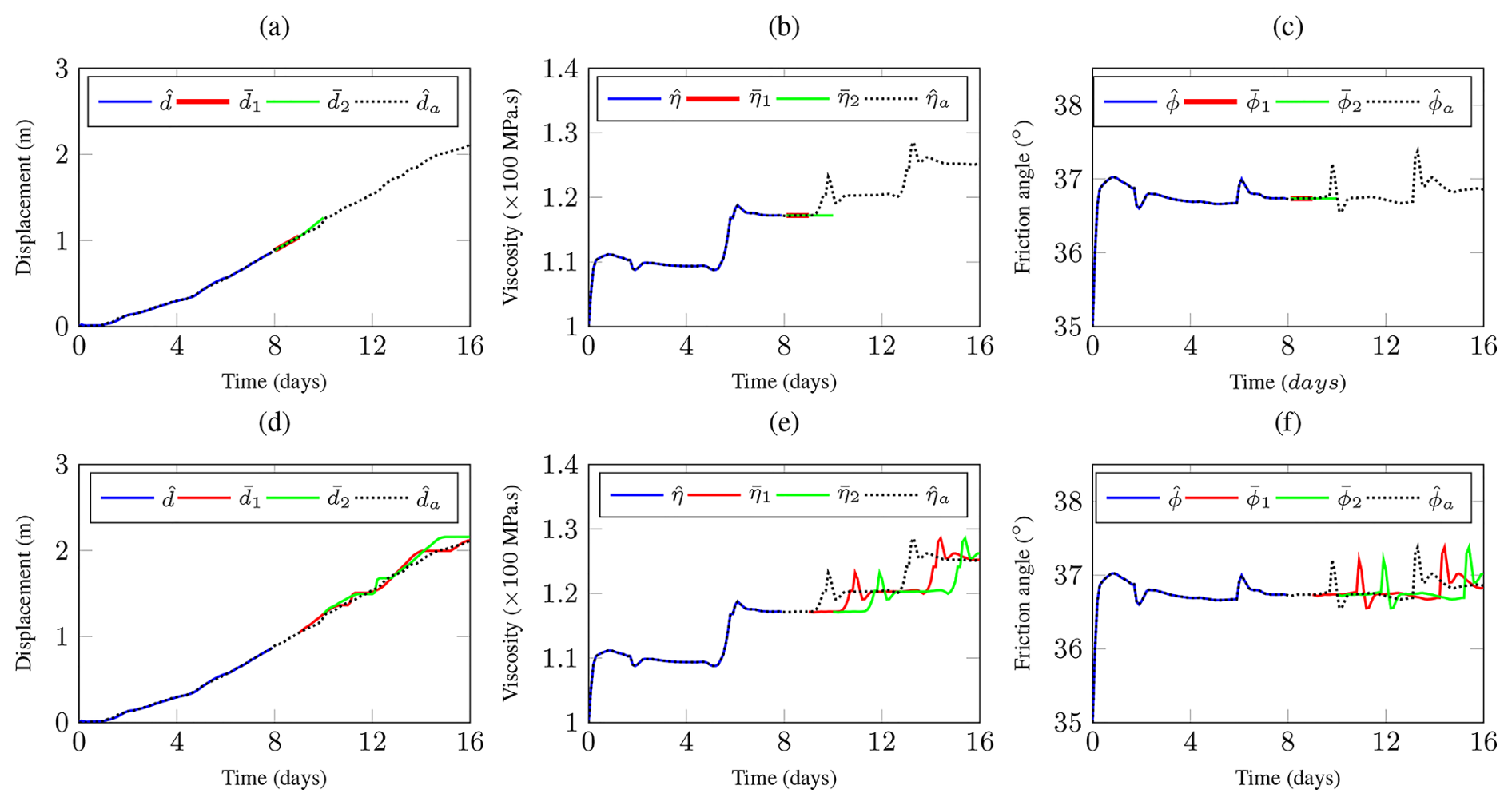 Figure 9Landslide displacement [d] and unknown parameters [η,ϕ] forecasting: (a)(c) forecasts with prediction horizon 1 d [d1,η1,ϕ1] and 2 d [d2,η2,ϕ2], (d)(f) forecasts with moving prediction horizon 1 d [d1,η1,ϕ1] and 2 d [d2,η2,ϕ2]. Plots (a)(f) also show estimated displacement, viscosity and friction angle [d^a,η^a,ϕ^a] from Sect. 4.