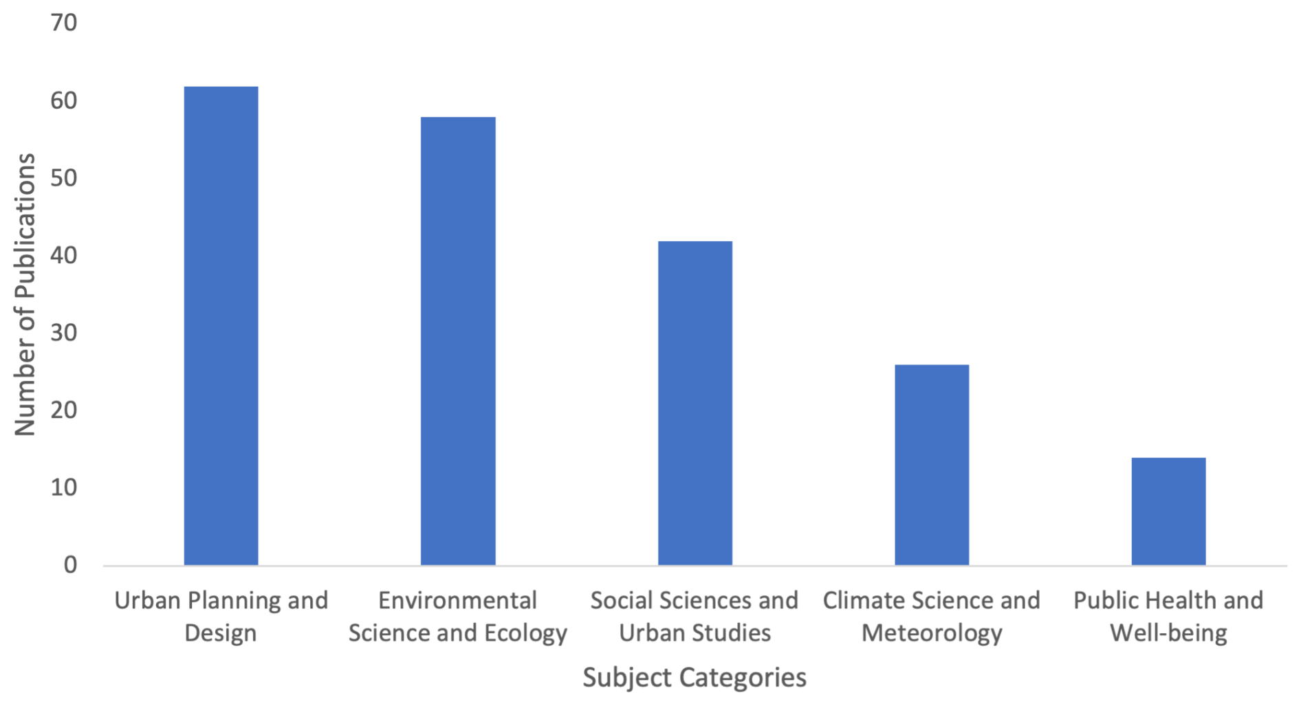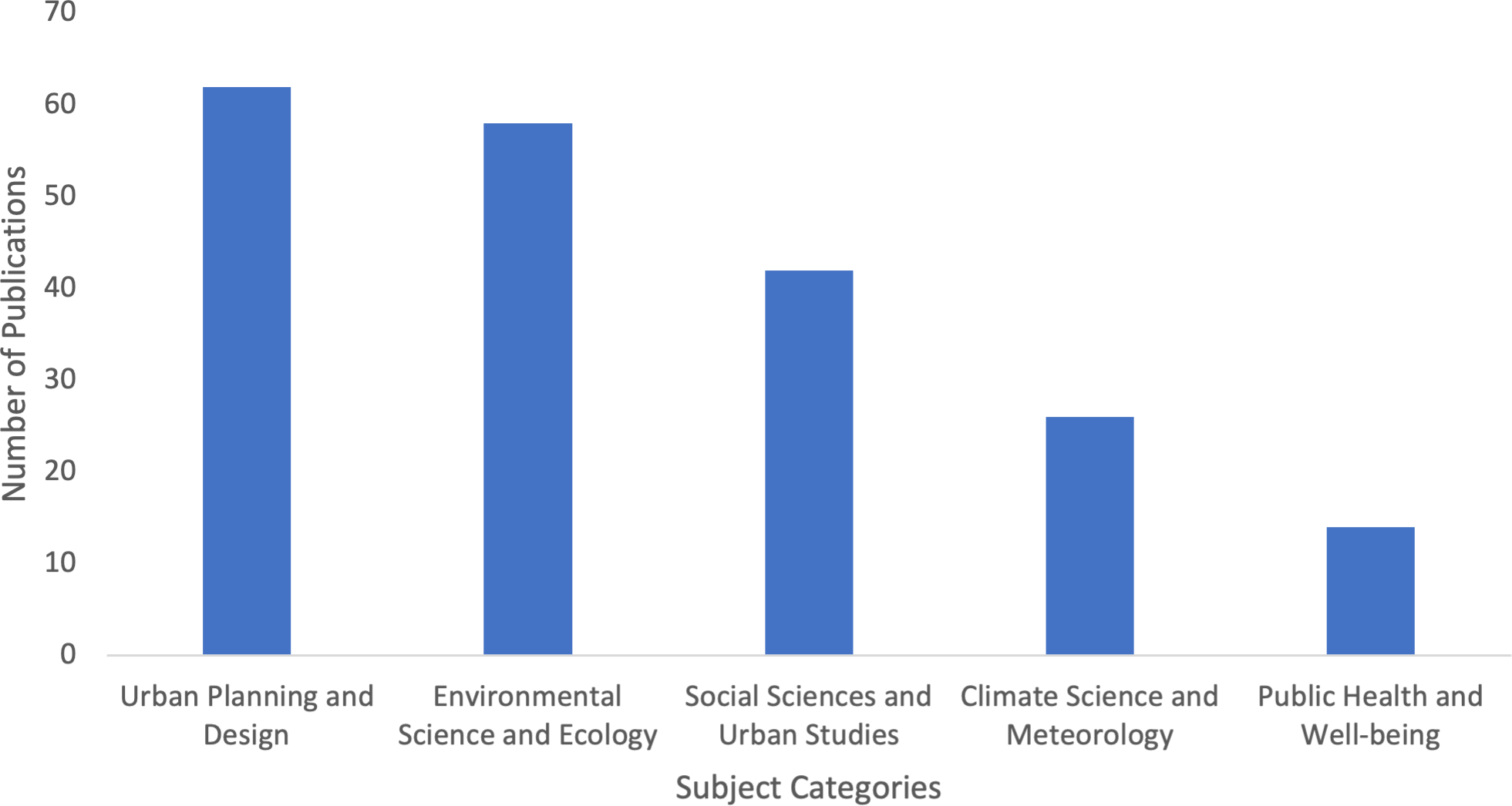 The selected papers can be assigned to five primary disciplines (Fig. 4): Urban Planning and Design, Environmental Science and Ecology, Social Sciences and Urban Studies, Climate Science and Meteorology, and Public Health and Well-being.