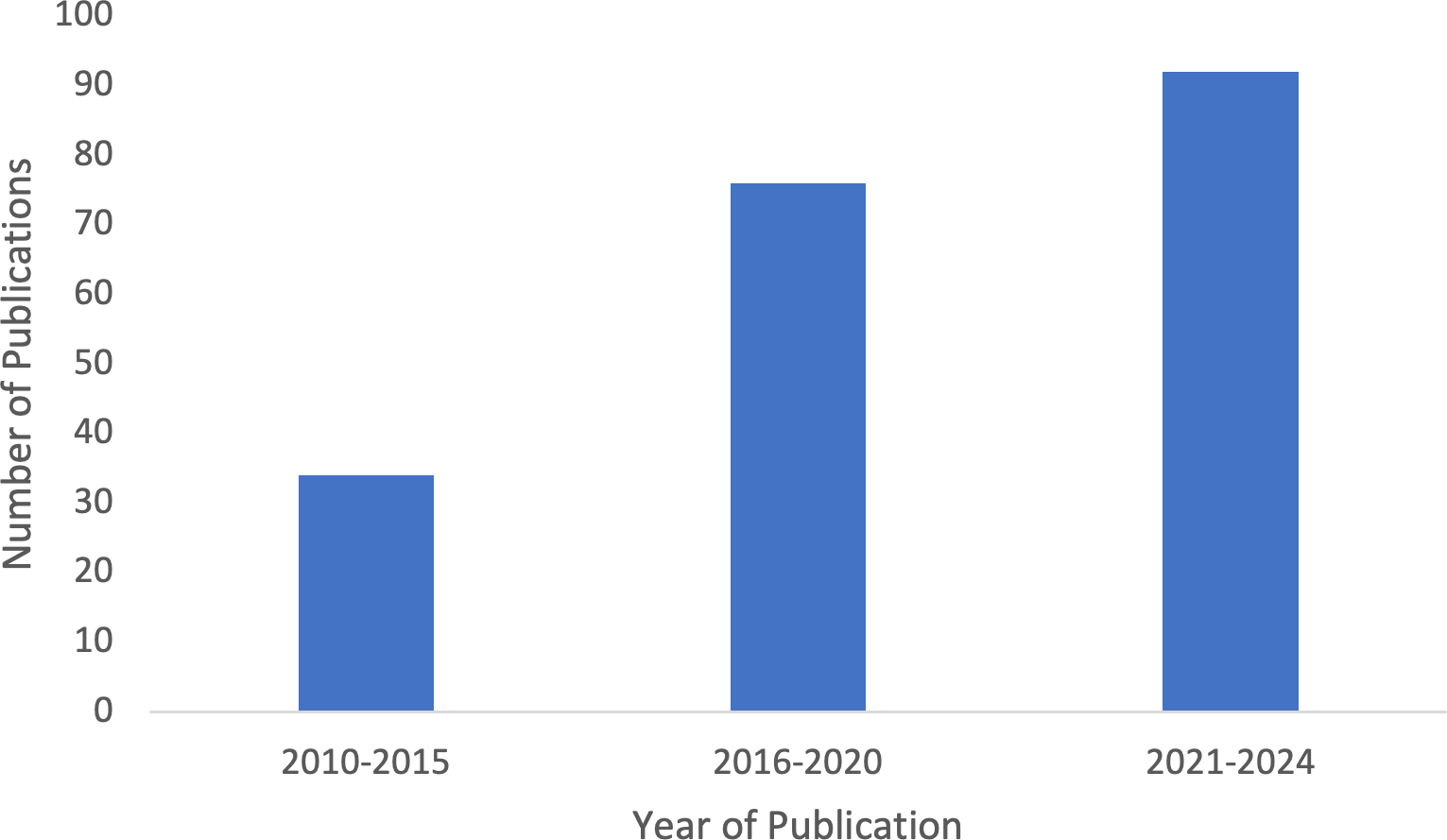Figure 5Temporal distribution of the reviewed papers where the bars show the total number of publications during the time-interval mentioned.