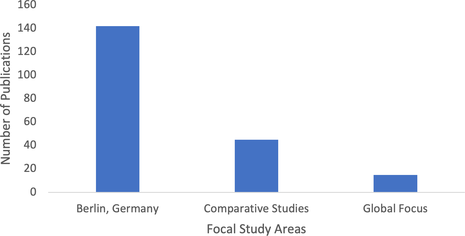 The focal study area of the selected papers primarily centres on Berlin, Germany, with some studies including comparative analyses with other global cities (Fig. 6). Berlin is a unique case study due to its historical, political, and social context, making it an ideal subject for examining the intersection of urban green spaces and sustainability.