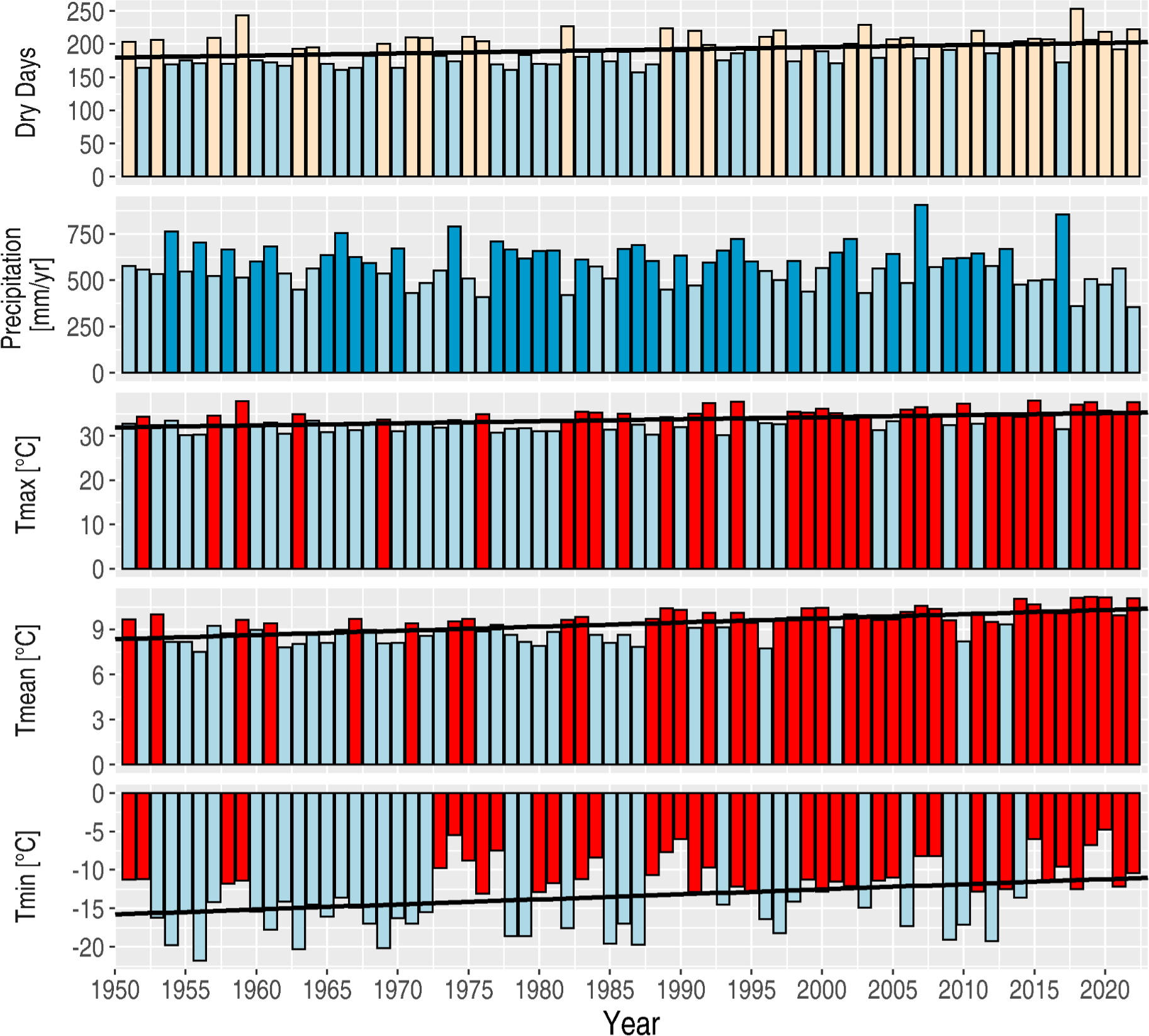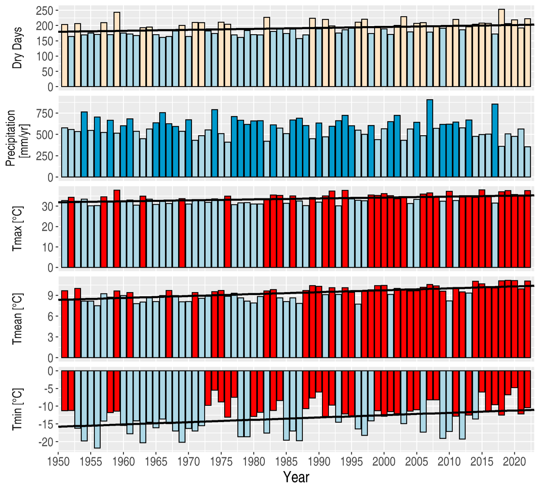 Figure 7Climate trends in Berlin (1950–2023): Precipitation and temperature variations with statistical significance. From top to bottom: The number of days without precipitation per year (beige/blue more/less than the long-term mean), Annual precipitation (light/dark blue less/more than the long-term mean), absolute temperature maximum of the year (blue/red lower/higher than the long-term mean), average temperature of the year (blue/red lower/higher than the long-term mean), and absolute temperature minimum of the year (blue/red lower/higher than the long-term mean). The long-term mean is based on the period 1950–2023. Black lines denote statistically significant linear trends (5 % level) (Data source: the weather station Berlin-Dahlem, Germany).