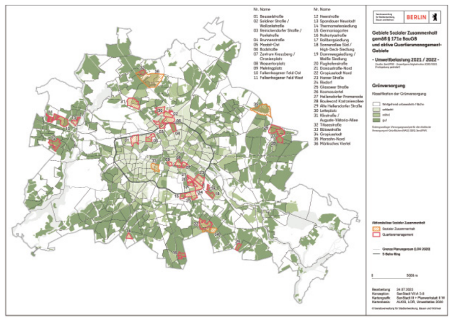 In 2020, the Berlin's Senate established the Charter for Berlin's Urban Green “Charta für das Berliner Stadtgrün” in order to ensure that urban development is also green development and adapted the action program for Berlin's Urban Green 2030 “Handlungsprogramm für das Berliner Stadtgrün 2030” with concrete projects, measures and instruments (https://www.berlin.de/sen/uvk/natur-und-gruen/charta-stadtgruen/, last access: 10 October 2025, https://www.berlin.de/sen/uvk/_assets/natur-gruen/charta-stadtgruen/charta.pdf?ts=1683531724 last access: 10 October 2025).