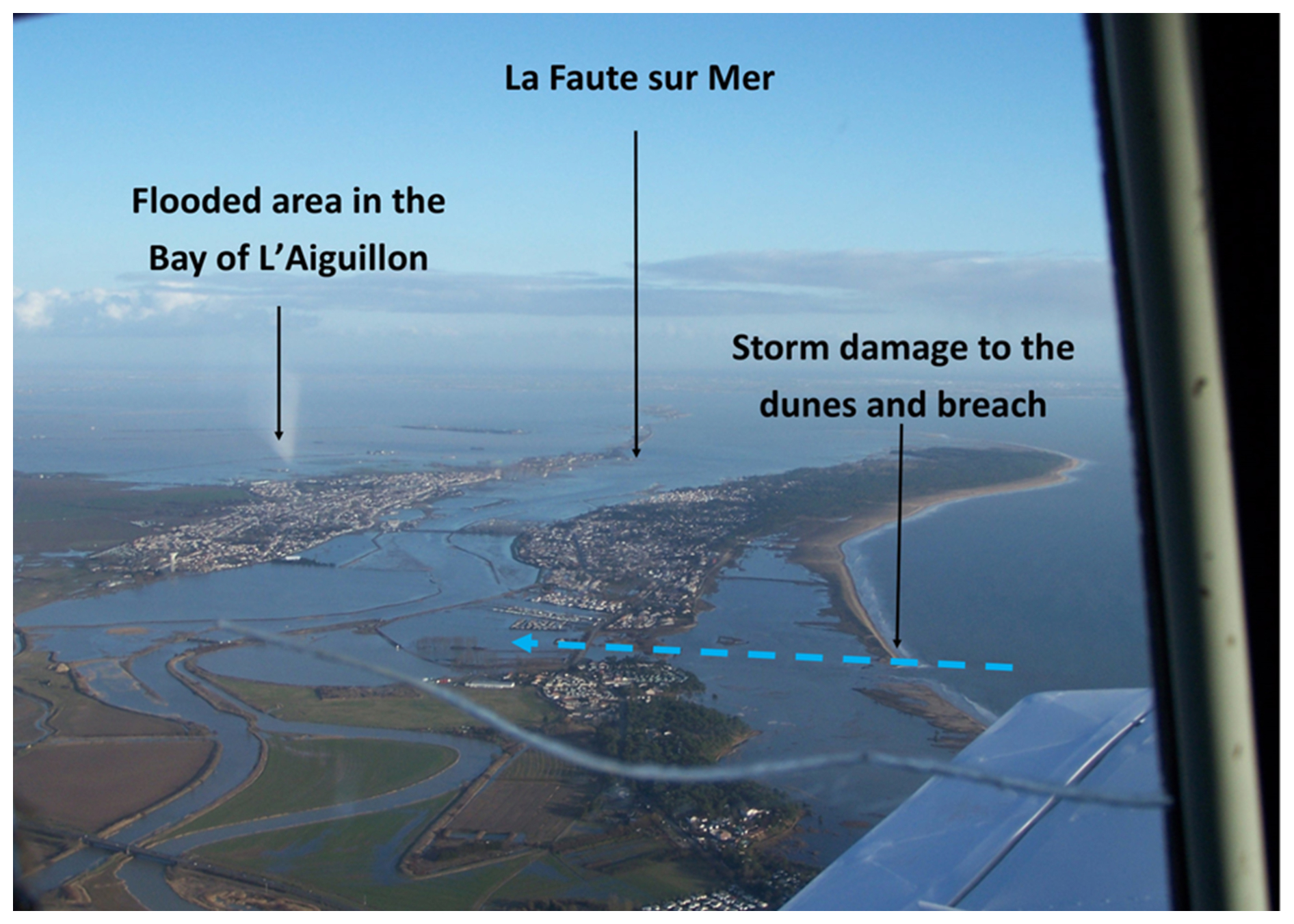 Figure 1Aerial photograph (28 February 2010) illustrating how the erosion of Belle Henriette (right) created an additional pathway for floodwaters (blue arrow) into La Faute-sur-Mer, France during Storm Xynthia 2010 (Photo J.-P. Bichon, interpretation M. Garcin, BRGM; see also Pedreros et al., 2010, Gerard and Lang, 2019).